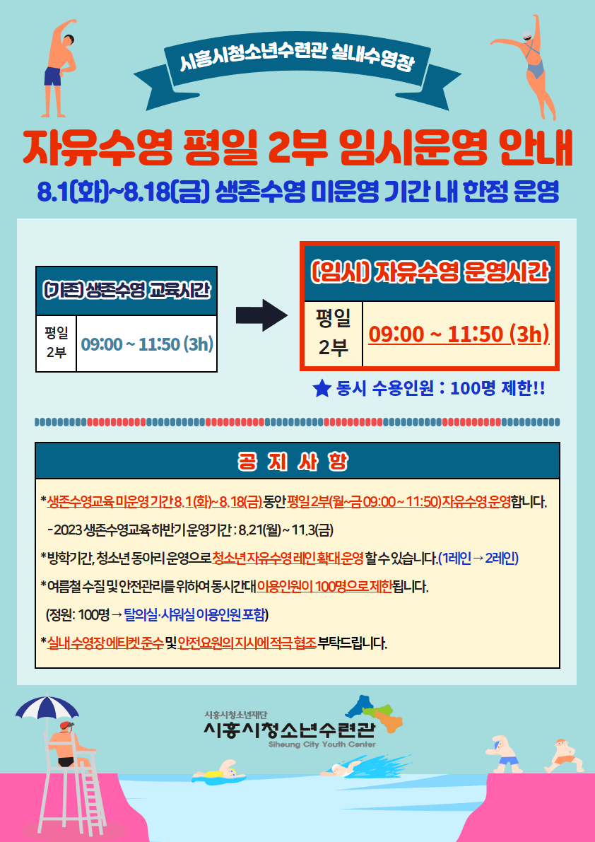 자유수영 평일 2부 임시운영 안내 작성자 관리자 등록일자 2023년 7월 14일 12시 18분 26초 조회 596 자유수영임시운영 안내.png [ Size : 132.89KB , Down : 369 ] 미리보기 다운로드 목록보기