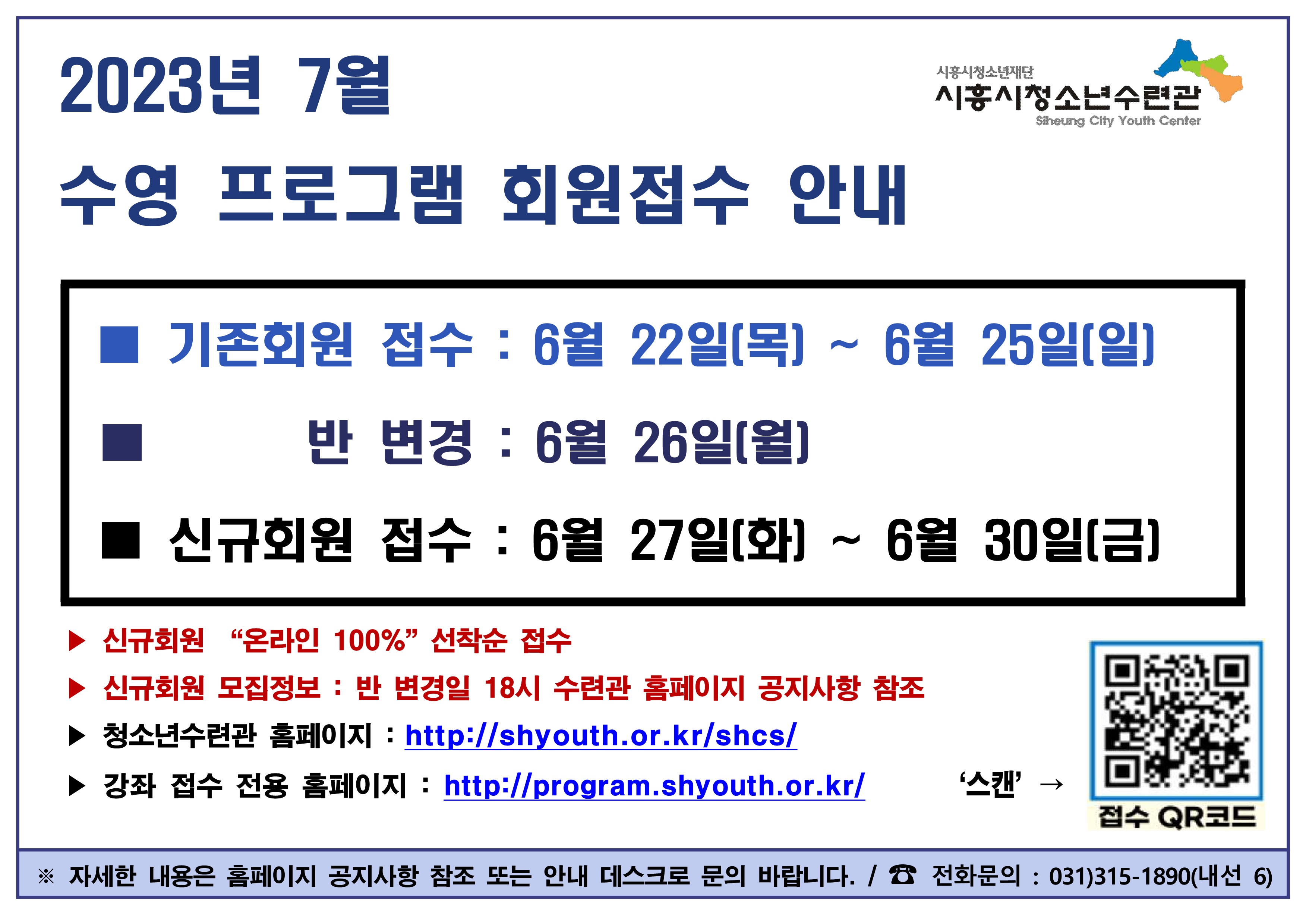 2023년 7월 수영 프로그램 회원(기존/신규) 접수 기간 안내 작성자 관리자 등록일자 2023년 6월 16일 14시 31분 12초 조회 713 기존접수 배너(23년 7월).jpg [ Size : 983.57KB , Down : 445 ] 미리보기 다운로드 목록보기