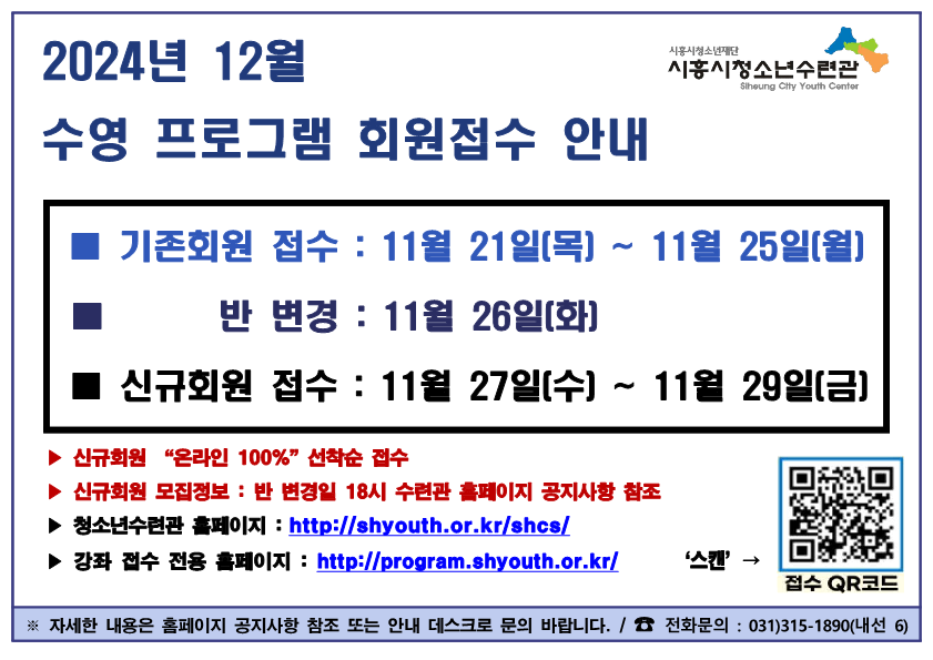 2024년 12월 수영 프로그램 회원(기존/신규) 접수 기간 안내 작성자 관리자 등록일자 2024년 11월 14일 13시 11분 55초 조회 582 기존접수 배너(24년 12월)_1.png [ Size : 132.4KB , Down : 1,053 ] 미리보기 다운로드 목록보기