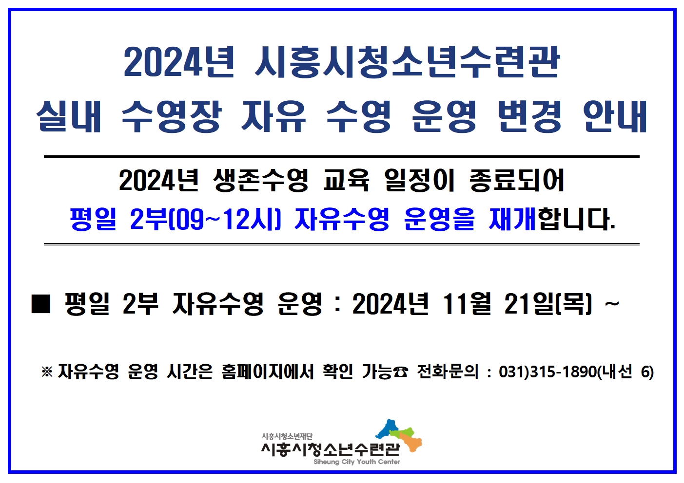 2024년 시흥시청소년수련관 실내수영장 평일 2부 자유수영 운영 변경 안내 작성자 관리자 등록일자 2024년 11월 18일 14시 4분 1초 조회 741 안내문001.jpg [ Size : 458.38KB , Down : 957 ] 미리보기 다운로드 목록보기