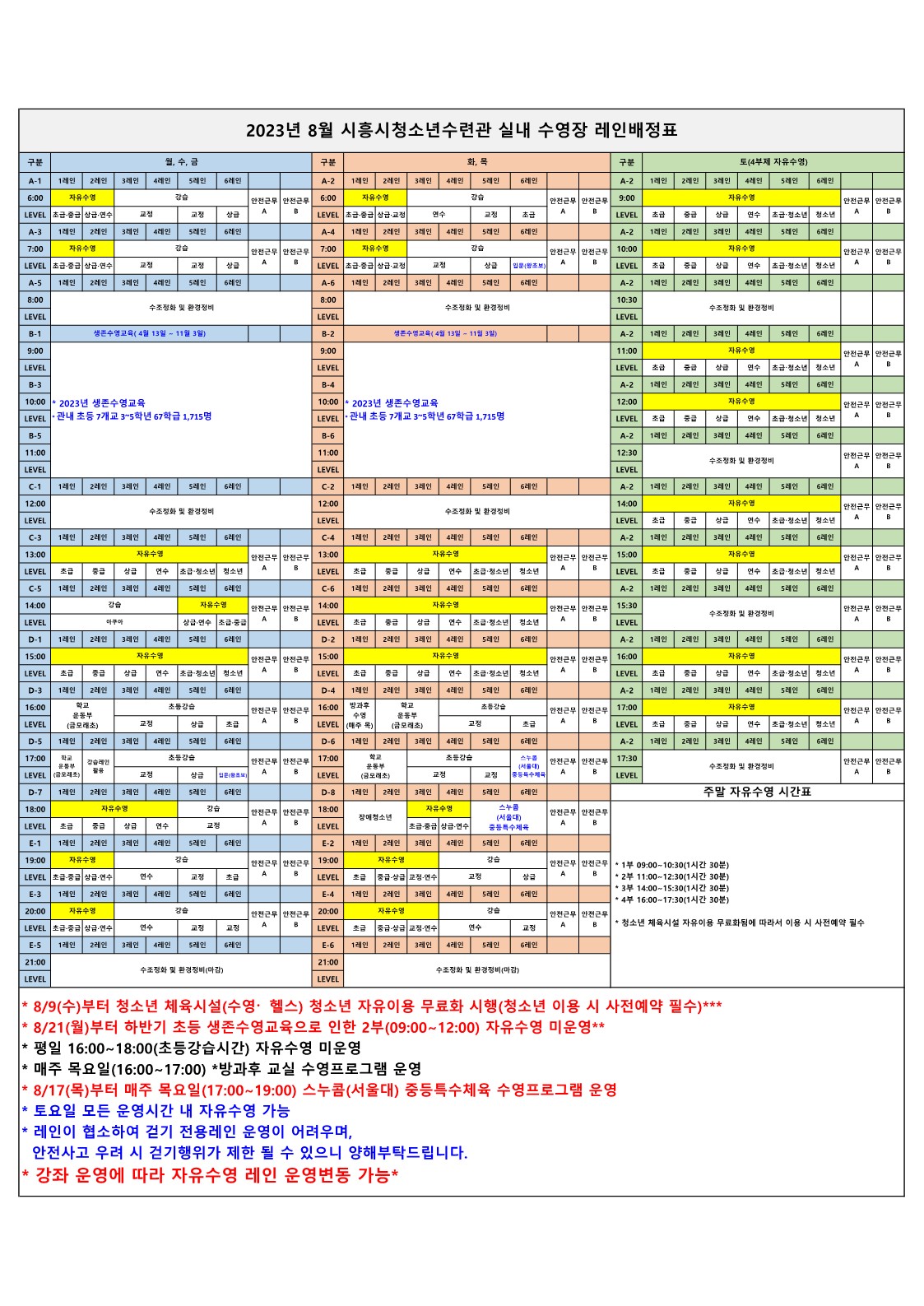 2023년 8월 자유수영 레인배정표 작성자 관리자 등록일자 2023년 8월 9일 7시 34분 38초 조회 647 2023년 8월 레인배정표.pdf [ Size : 271.59KB , Down : 789 ] 다운로드 2023년 8월 레인배정표.jpg [ Size : 483.67KB , Down : 741 ] 미리보기 다운로드 목록보기