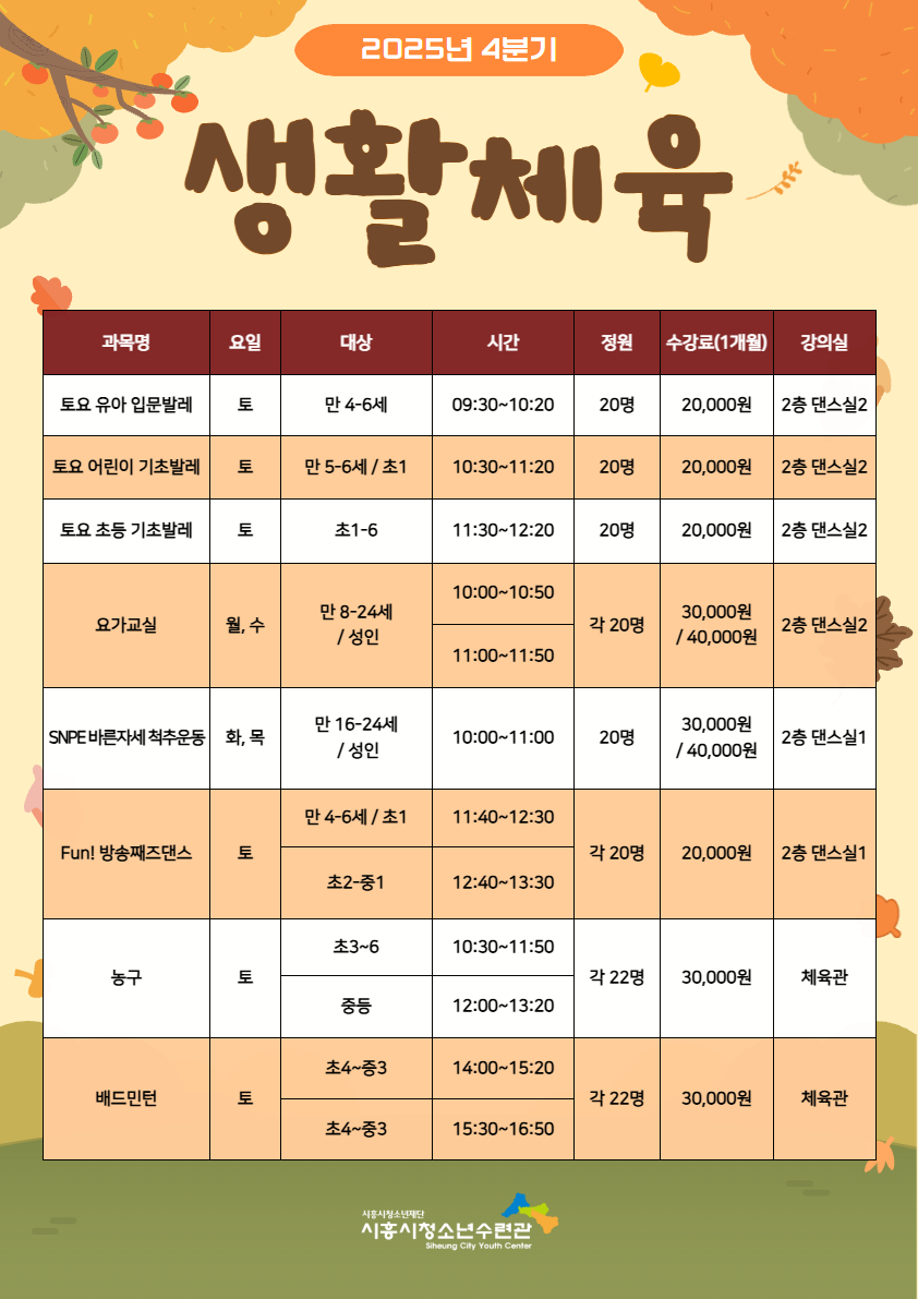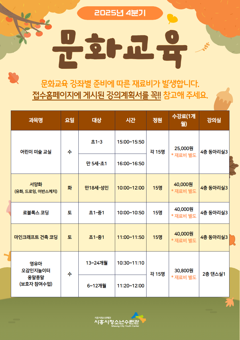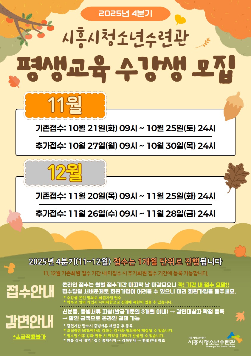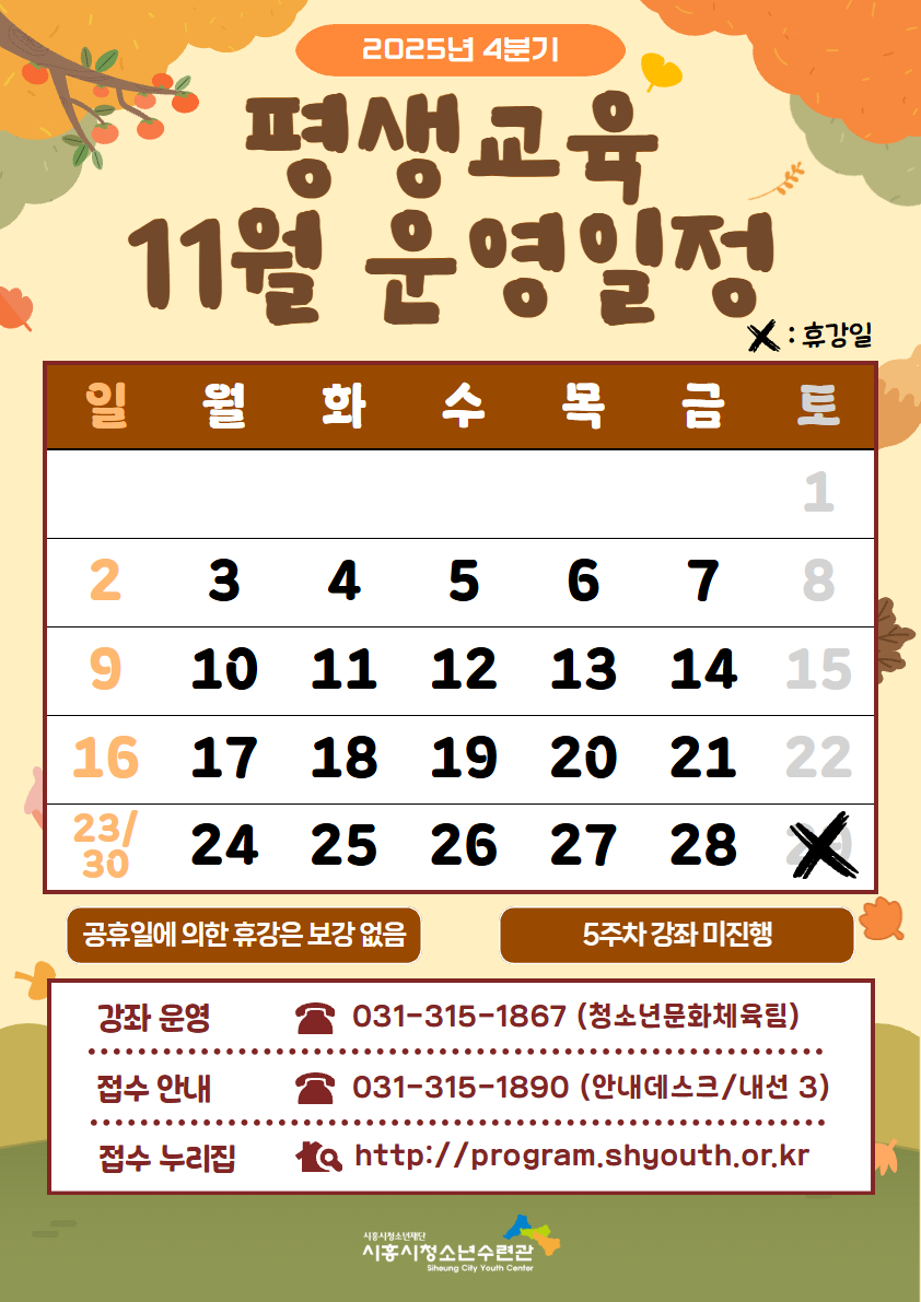 2025년 11월 평생교육(문화교육, 생활체육) 강좌 수강생 모집 안내 작성자 관리자 등록일자 2025년 10월 15일 16시 9분 34초 조회 522 25년 4분기(11월) 평생교육 홍보물 1.jpg [ Size : 807.66KB , Down : 721 ] 미리보기 다운로드 25년 4분기(11월) 평생교육 홍보물 2.jpg [ Size : 442.35KB , Down : 709 ] 미리보기 다운로드 25년 4분기(11월) 평생교육 홍보물 3.jpg [ Size : 531.42KB , Down : 702 ] 미리보기 다운로드 25년 4분기(11월) 평생교육 홍보물 4.jpg [ Size : 622.38KB , Down : 693 ] 미리보기 다운로드 목록보기