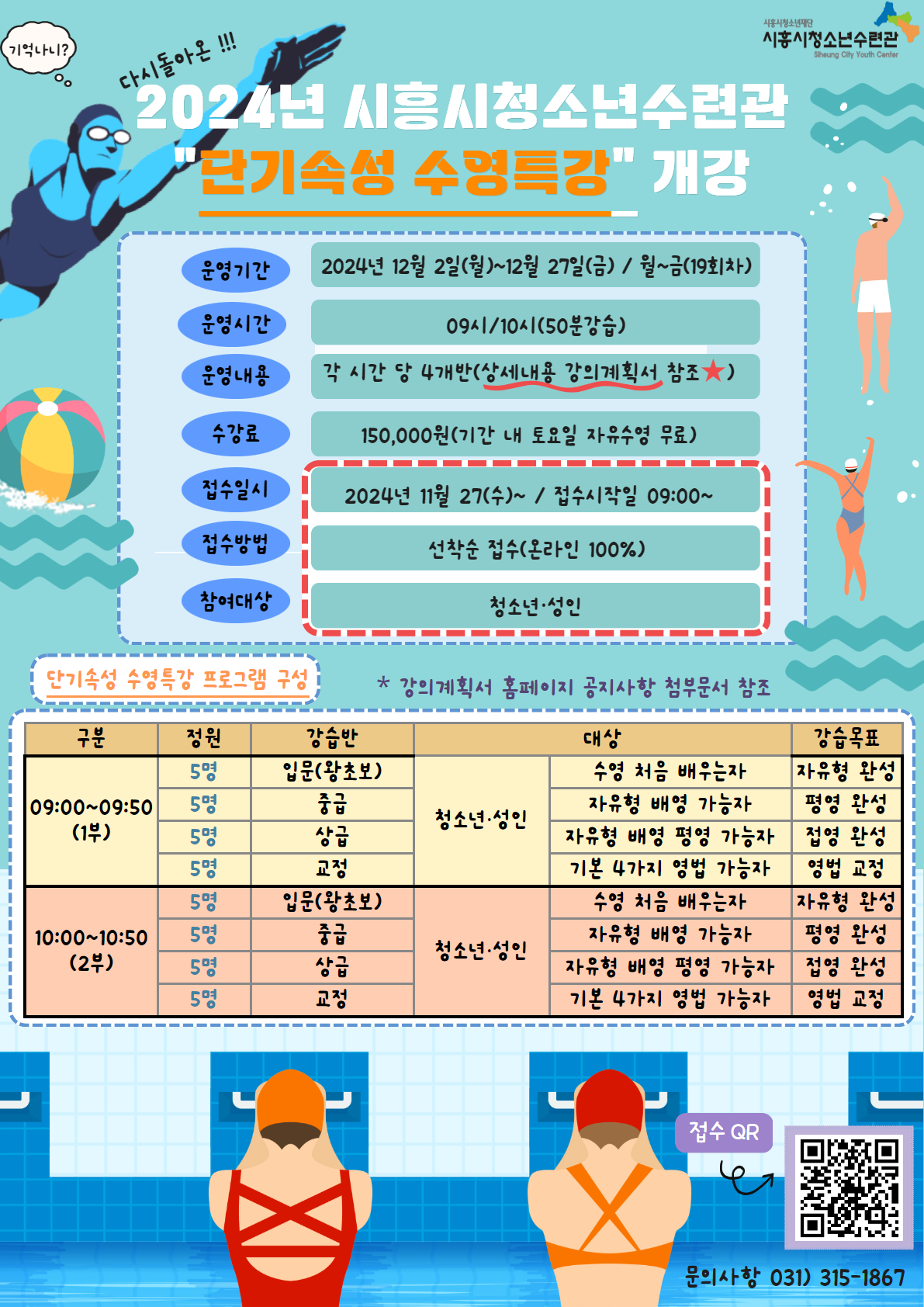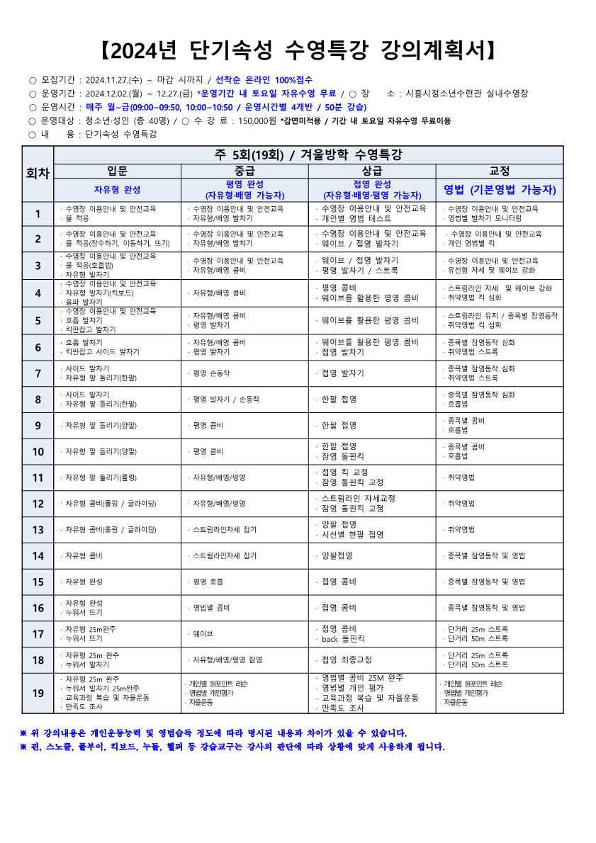 2024년 시흥시청소년수련관 12월 "단기속성 수영특강" 개강 (수정) 작성자 관리자 등록일자 2024년 11월 19일 10시 2분 17초 조회 673 2024 단기속성 수영특강.png [ Size : 477.93KB , Down : 963 ] 미리보기 다운로드 2024 단기속성 수영특강 강의계획서_수정_1.png [ Size : 196.85KB , Down : 953 ] 미리보기 다운로드 목록보기