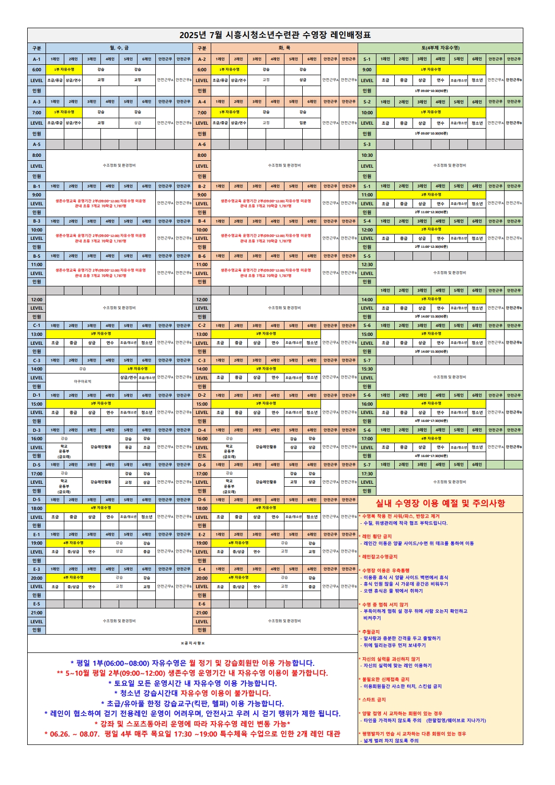 2025년 7월 시흥시청소년수련관 실내 수영장 레인 배정표 작성자 관리자 등록일자 2025년 7월 8일 15시 40분 28초 조회 322 2025년 7월 수영장 레인배정표(수정필요)_1.jpg [ Size : 1.13MB , Down : 529 ] 미리보기 다운로드 목록보기