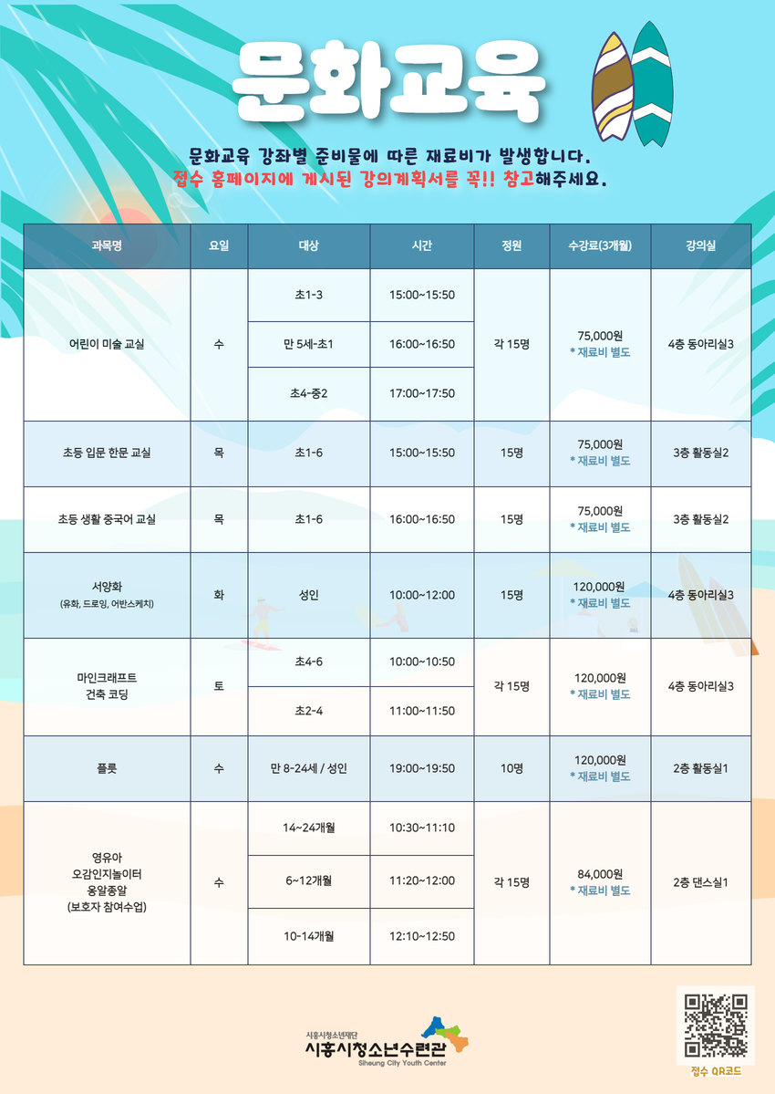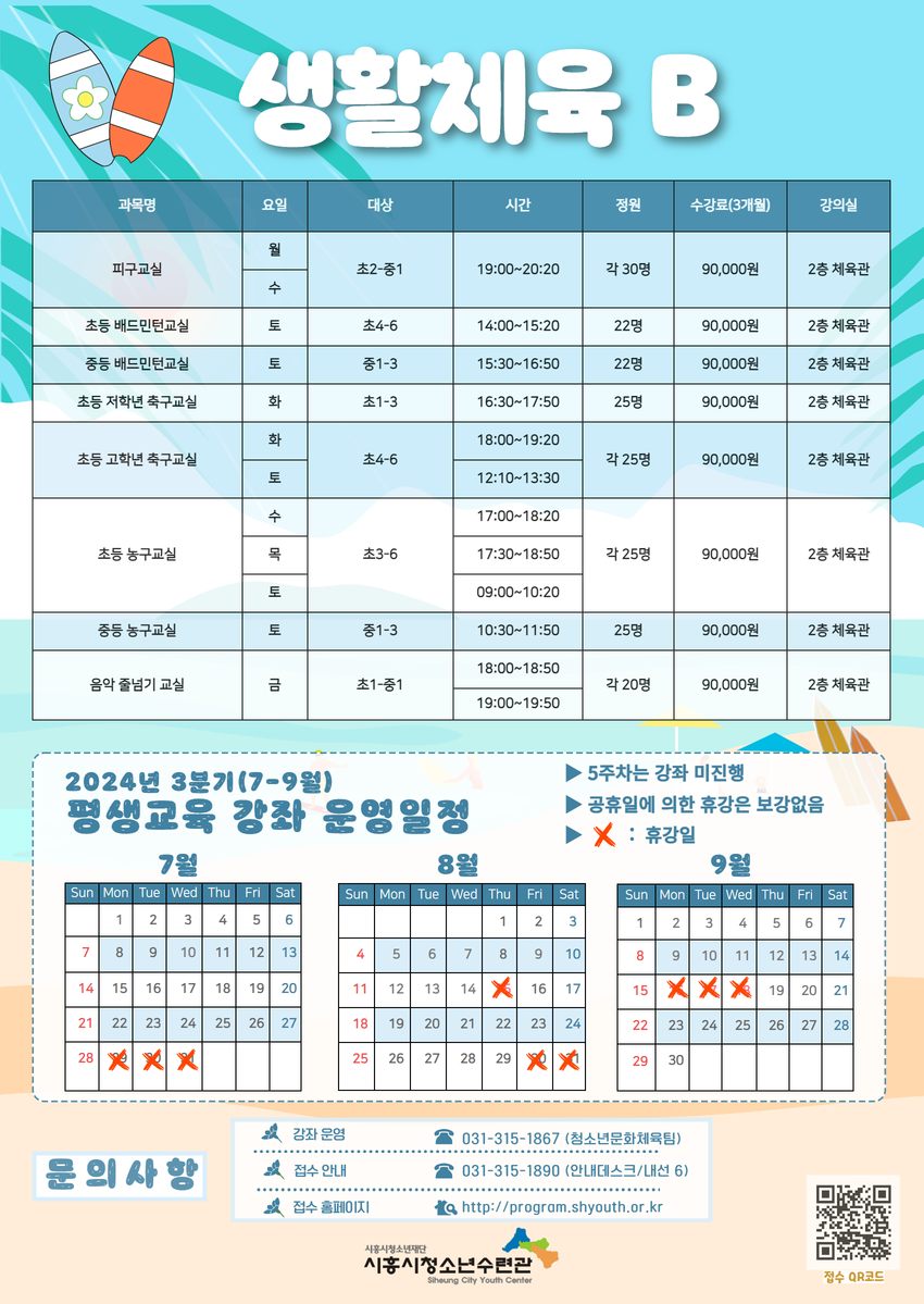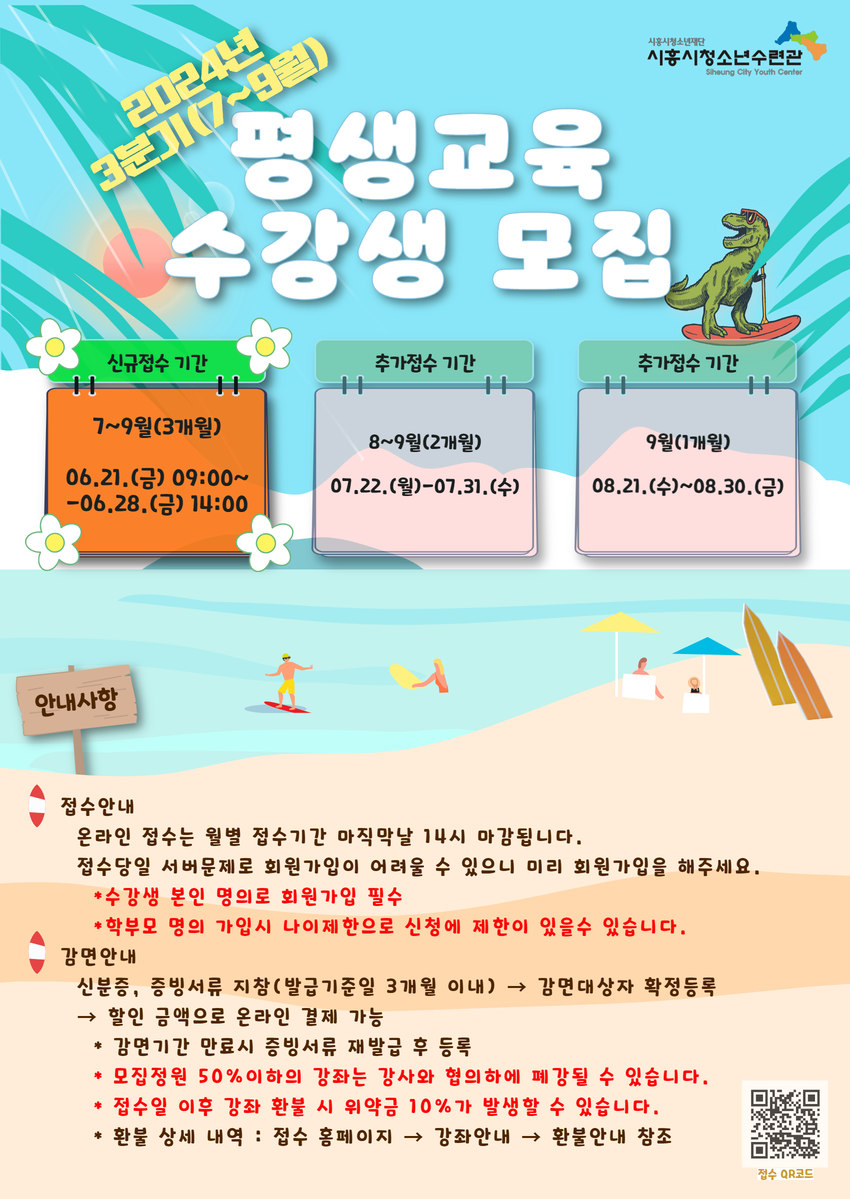2024년 3분기 평생교육(문화강좌, 생활체육) 강좌 수강생 모집 안내 작성자 관리자 등록일자 2024년 6월 10일 13시 32분 21초 조회 2,198 2024년 3분기 평생교육 수강생 모집 1.png [ Size : 595.56KB , Down : 3,534 ] 미리보기 다운로드 2024년 3분기 평생교육 수강생 모집 2.png [ Size : 360.6KB , Down : 3,473 ] 미리보기 다운로드 2024년 3분기 평생교육 수강생 모집 3.png [ Size : 380.11KB , Down : 3,493 ] 미리보기 다운로드 2024년 3분기 평생교육 수강생 모집 4.png [ Size : 441.59KB , Down : 3,489 ] 미리보기 다운로드 목록보기
