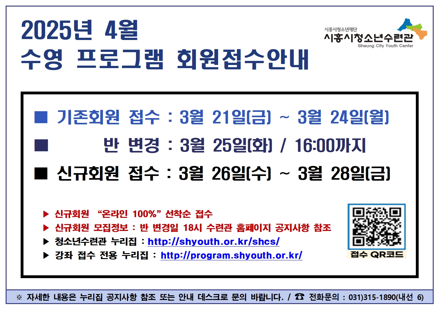 2025년 4월 수영 프로그램 회원(기존/신규) 접수 기간 안내 작성자 관리자 등록일자 2025년 3월 14일 14시 33분 36초 조회 496 기존접수 배너(25년 4월)001.jpg [ Size : 556.16KB , Down : 1,012 ] 미리보기 다운로드 목록보기