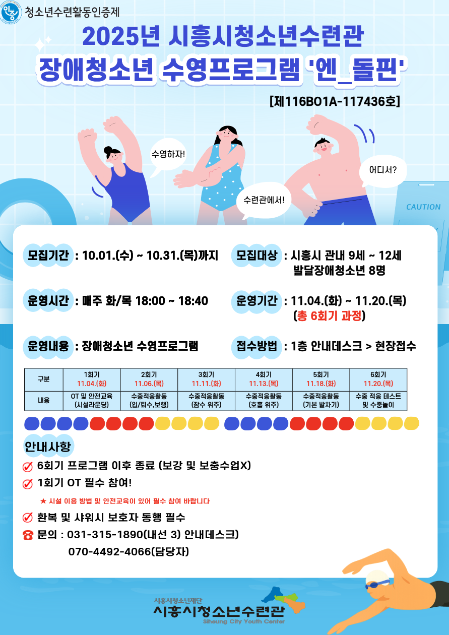 2025년 시흥시청소년수련관 발달장애청소년 수영 프로그램 '엔-돌핀' 모집 홍보 작성자 관리자 등록일자 2025년 10월 1일 13시 58분 26초 조회 139 엔-돌핀 홍보 포스터.png [ Size : 277.4KB , Down : 134 ] 미리보기 다운로드 목록보기