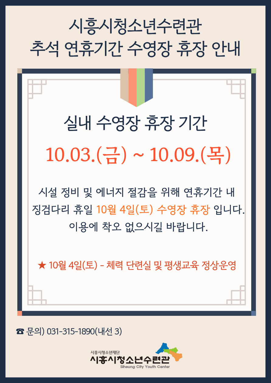 2025년 시흥시청소년수련관 추석 연휴기간 수영장 휴장 안내 작성자 관리자 등록일자 2025년 9월 24일 18시 33분 22초 조회 181 휴장 홍보물.png [ Size : 138.47KB , Down : 185 ] 미리보기 다운로드 목록보기