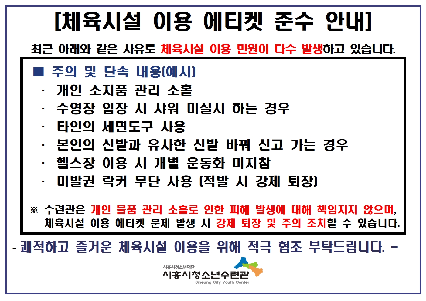 체육시설 이용 에티켓 준수 안내 작성자 관리자 등록일자 2025년 2월 11일 14시 54분 21초 조회 262 체육시설 이용 에티켓 준수 안내001.jpg [ Size : 594.44KB , Down : 310 ] 미리보기 다운로드 목록보기