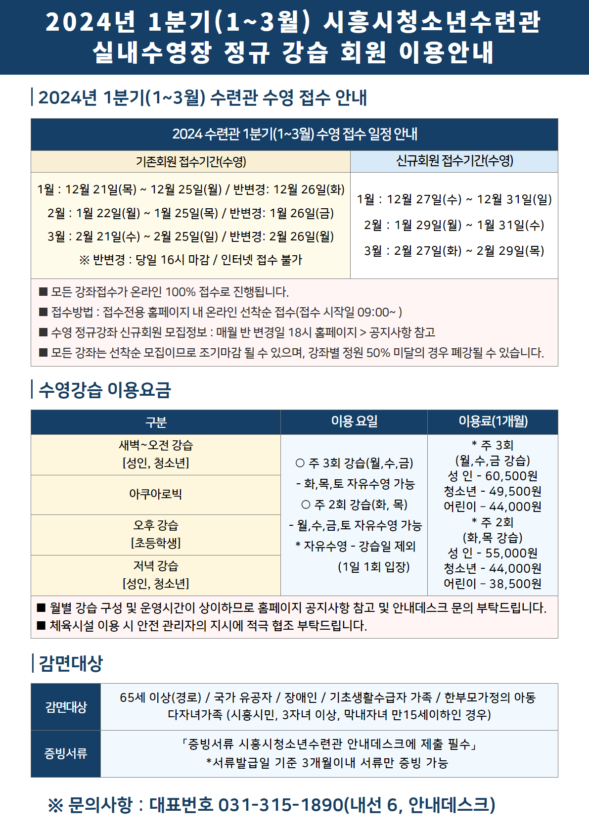 2024년 1분기(1~3월) 시흥시청소년수련관 실내수영장 정규 강습 회원 이용안내 작성자 관리자 등록일자 2023년 12월 8일 15시 4분 26초 조회 630 2024년 1분기(1~3월) 시흥시청소년수련관 실내수영장 정규 강습 회원 이용안내.png [ Size : 208.46KB , Down : 778 ] 미리보기 다운로드 2024년 1분기(1~3월) 시흥시청소년수련관 실내수영장 정규 강습 회원 이용안내 2.png [ Size : 204.85KB , Down : 767 ] 미리보기 다운로드 목록보기