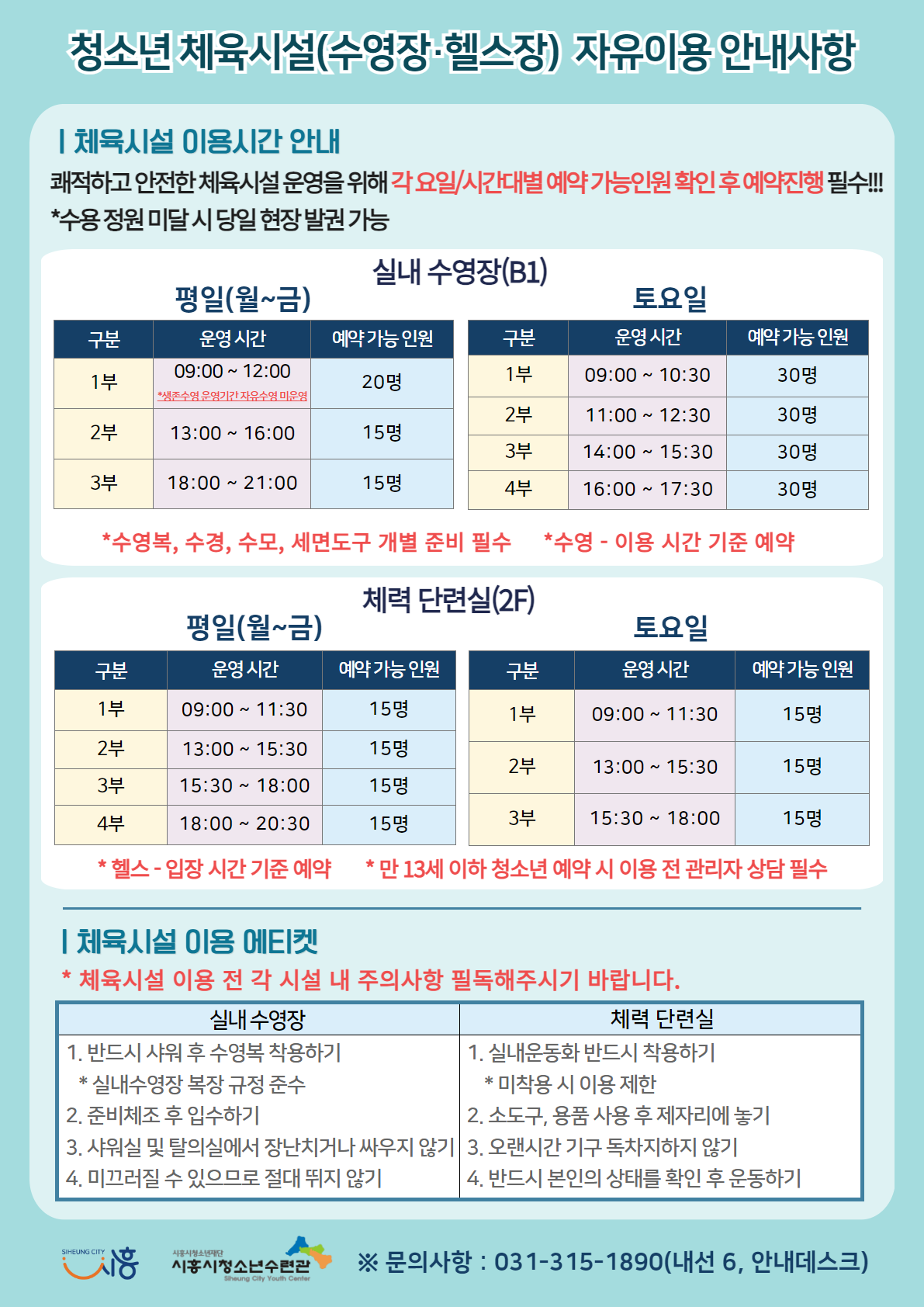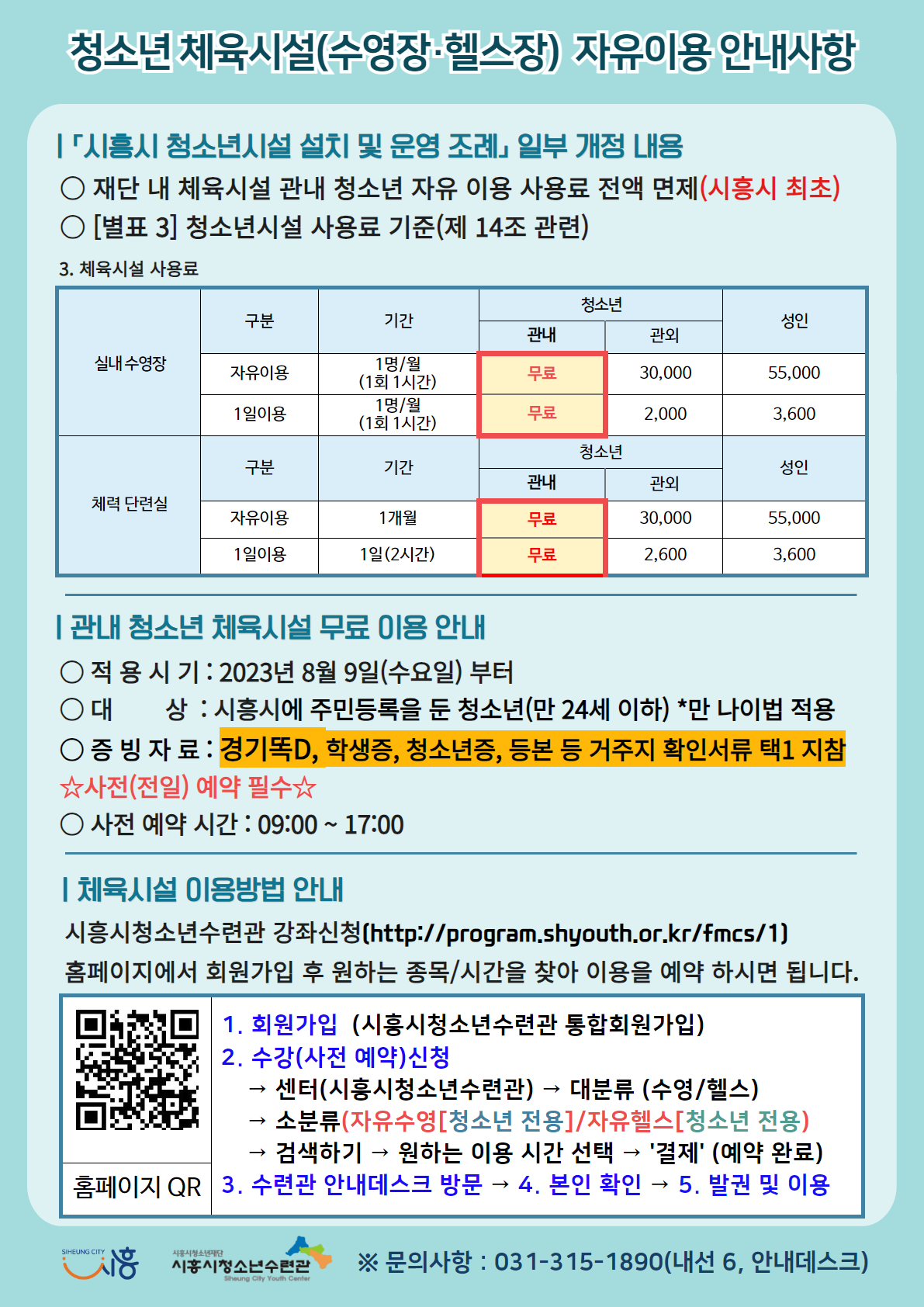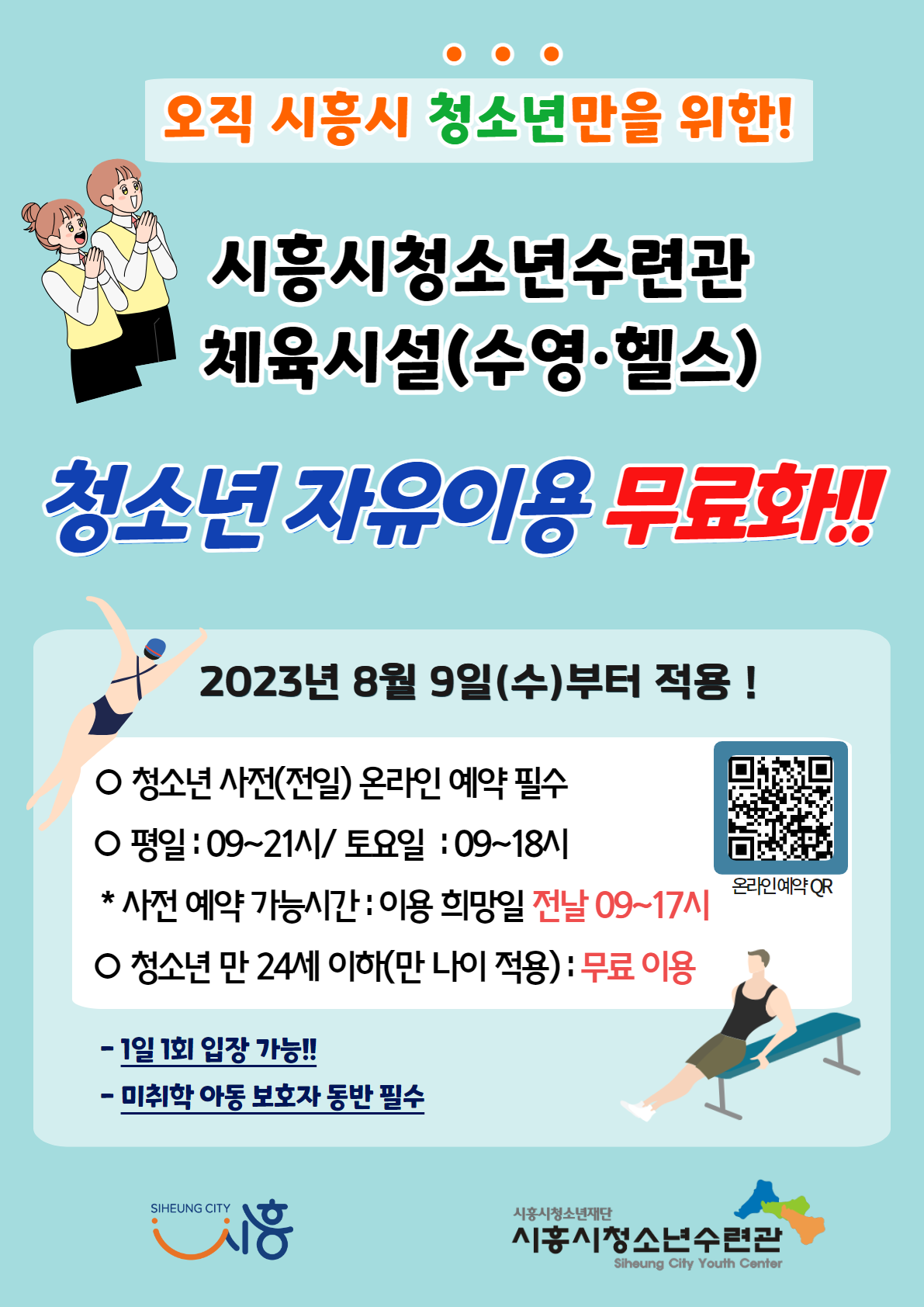 시흥시청소년수련관 체육시설(수영·헬스) 청소년 자유이용 무료화 안내 작성자 한아름 등록일자 2023년 8월 5일 10시 6분 28초 조회 1,223 1.png [ Size : 307.34KB , Down : 896 ] 미리보기 다운로드 2.png [ Size : 251.46KB , Down : 924 ] 미리보기 다운로드 3.png [ Size : 294.32KB , Down : 921 ] 미리보기 다운로드 목록보기