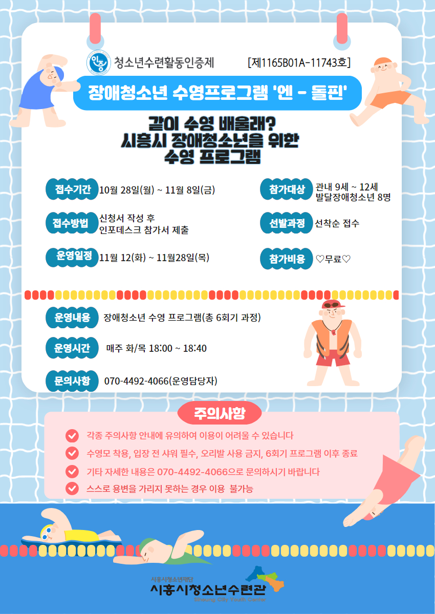 2024년 시흥시청소년수련관 장애청소년 수영프로그램 엔-돌핀(Dolphin) 참가자 모집 안내