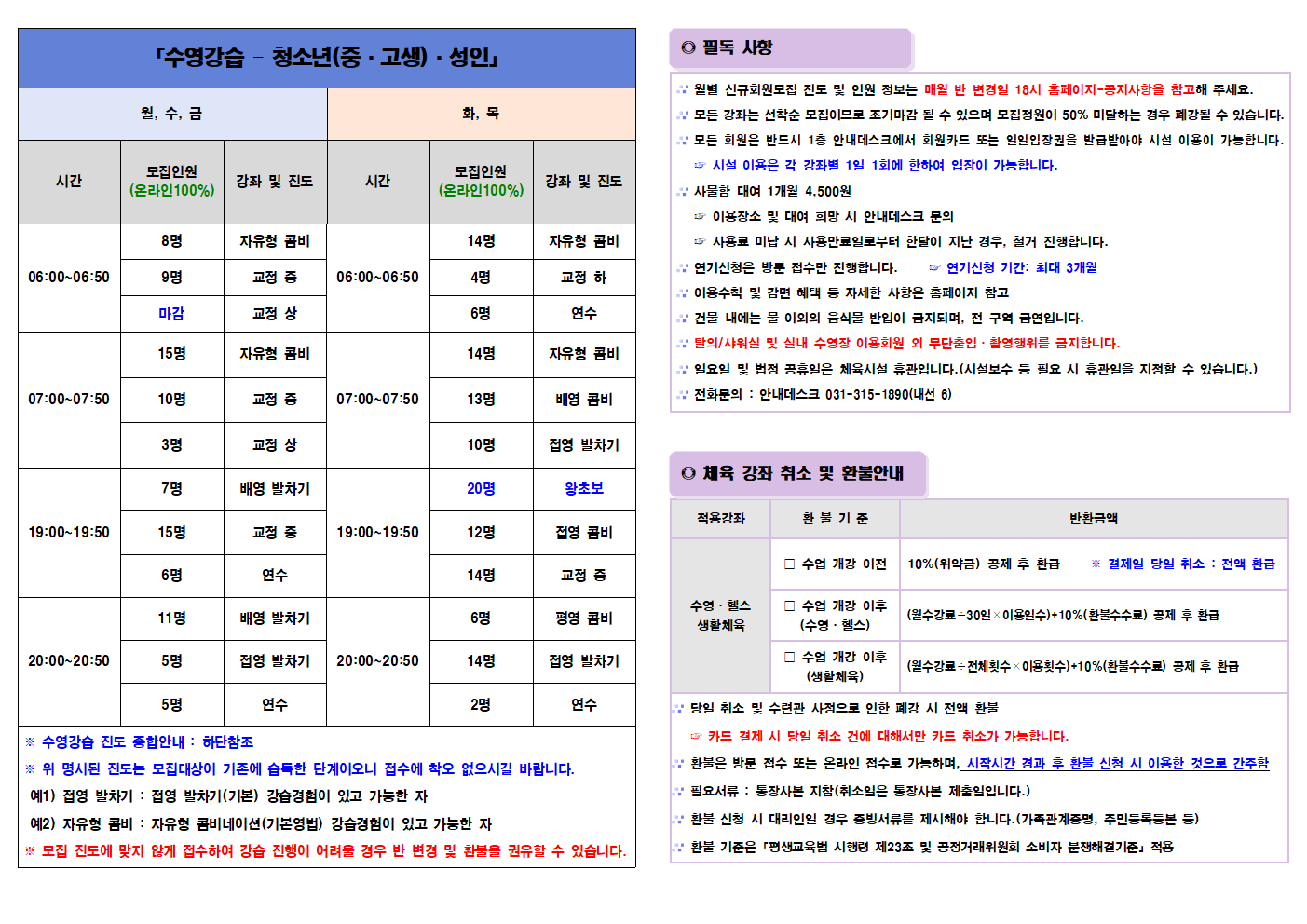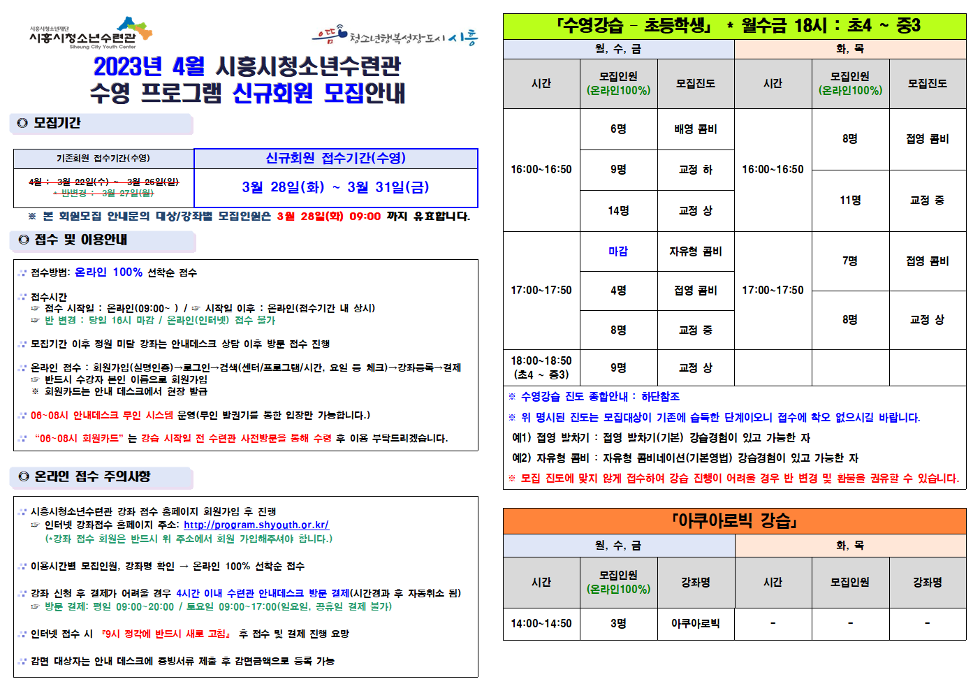 [2023년 4월] 시흥시청소년수련관 수영 프로그램 신규회원 모집 안내 작성자 관리자 등록일자 2023년 3월 27일 16시 25분 18초 조회 1,140 2023년 4월 연령/시간대별 강습반 모집인원은 첨부파일(이미지)을 확인해주세요~ 2023년 4월 시흥시청소년수련관 수영강좌 신규회원 모집안내(안)001.png [ Size : 135.37KB , Down : 1,073 ] 미리보기 다운로드 2023년 4월 시흥시청소년수련관 수영강좌 신규회원 모집안내(안)002.png [ Size : 115.23KB , Down : 1,030 ] 미리보기 다운로드 2023년 4월 시흥시청소년수련관 수영강좌 신규회원 모집안내(안)003.png [ Size : 54.98KB , Down : 739 ] 미리보기 다운로드 목록보기