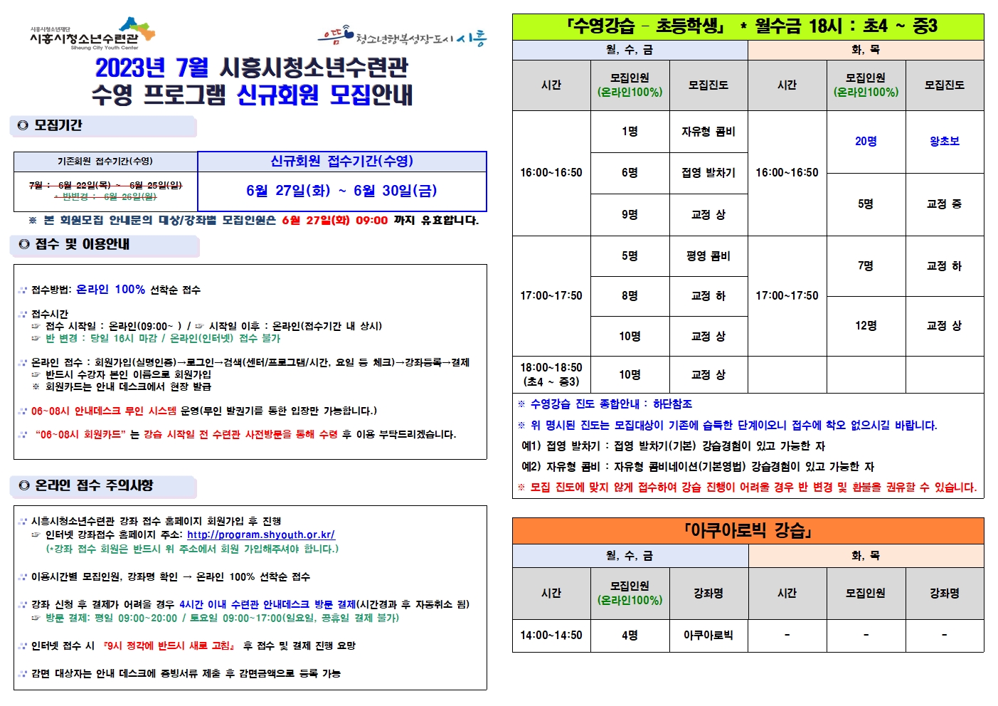 [2023년 7월] 시흥시청소년수련관 수영 프로그램 신규회원 모집 안내 작성자 관리자 등록일자 2023년 6월 26일 16시 51분 6초 조회 1,510 2023년 7월 시흥시청소년수련관 수영강좌 신규회원 모집안내(안)001.jpg [ Size : 710.19KB , Down : 2,357 ] 미리보기 다운로드 2023년 7월 시흥시청소년수련관 수영강좌 신규회원 모집안내(안)002.jpg [ Size : 743.24KB , Down : 2,250 ] 미리보기 다운로드 7월 모집005.jpg [ Size : 514.27KB , Down : 2,115 ] 미리보기 다운로드 목록보기