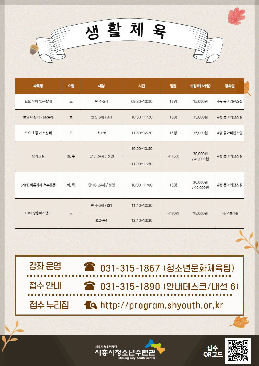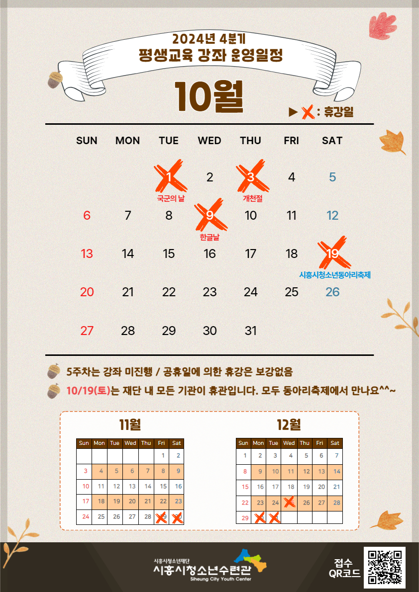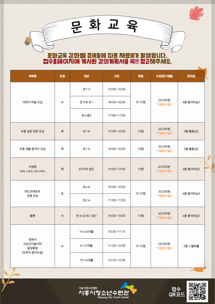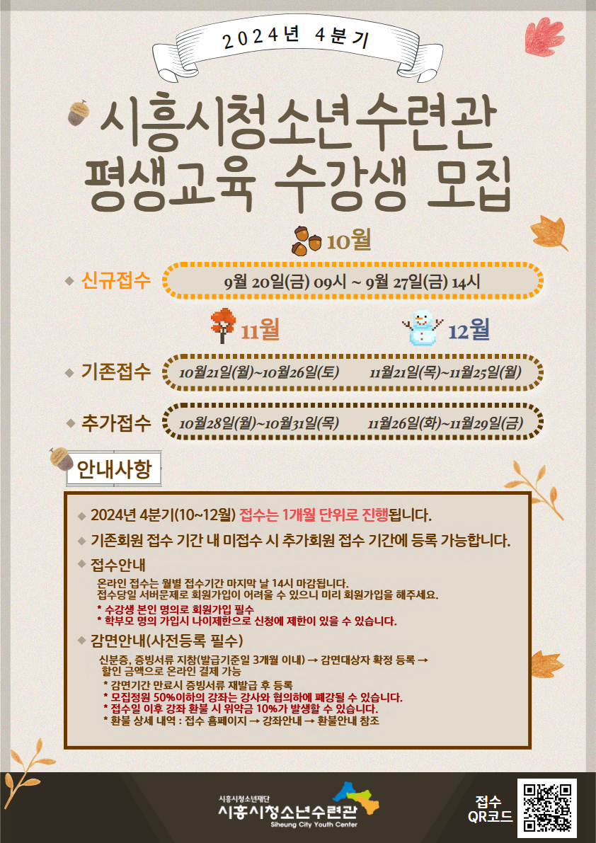 2024년 10월 평생교육(문화강좌, 생활체육) 강좌 수강생 모집 안내 작성자 관리자 등록일자 2024년 9월 11일 15시 54분 37초 조회 950 4분기 평생교육 수강생 모집_완료 1.jpg [ Size : 1.39MB , Down : 1,572 ] 미리보기 다운로드 4분기 평생교육 수강생 모집_완료 2.jpg [ Size : 1.07MB , Down : 1,499 ] 미리보기 다운로드 4분기 평생교육 수강생 모집_완료 3.jpg [ Size : 1.19MB , Down : 1,498 ] 미리보기 다운로드 4분기 평생교육 수강생 모집_완료 4.jpg [ Size : 1.41MB , Down : 1,506 ] 미리보기 다운로드 목록보기