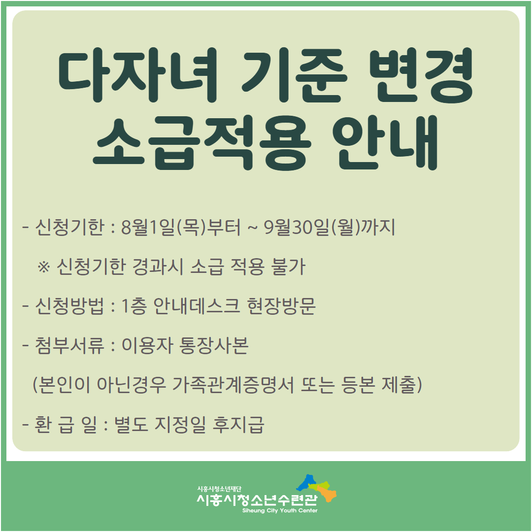 다자녀 기준 변경에 따른 소급적용 안내 작성자 관리자 등록일자 2024년 7월 31일 15시 3분 41초 조회 488 다자녀 소급 적용.jpg [ Size : 405.22KB , Down : 643 ] 미리보기 다운로드 목록보기