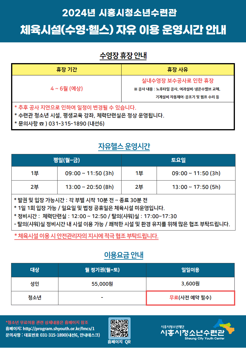 수영·헬스 자유 이용 운영시간 안내 작성자 관리자 등록일자 2024년 3월 27일 10시 19분 12초 조회 915 헬스운영시간 안내.png [ Size : 113.43KB , Down : 1,157 ] 미리보기 다운로드 목록보기