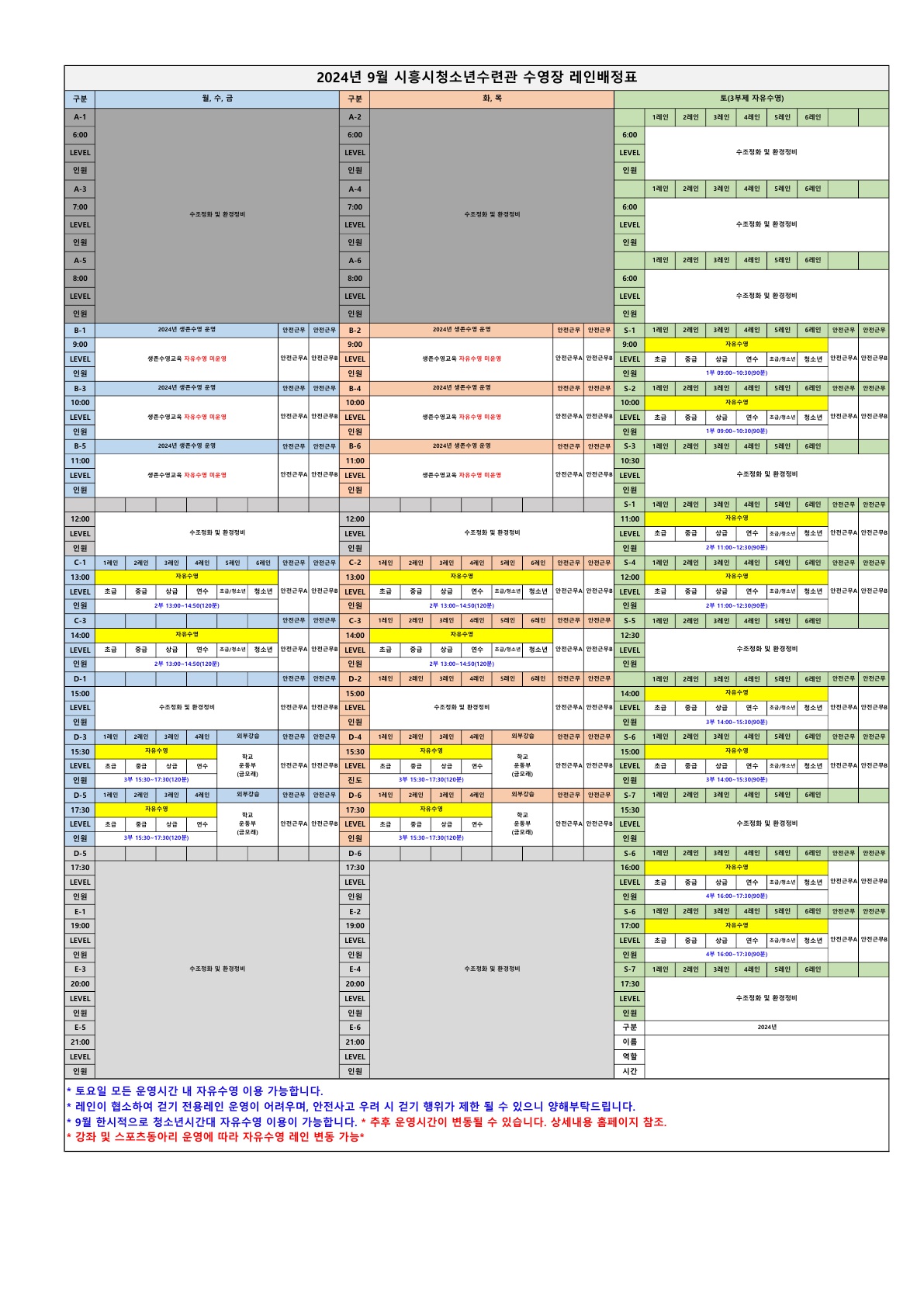 2024년 9월 시흥시청소년수련관 실내수영장 자유수영 레인배정표 작성자 관리자 등록일자 2024년 8월 29일 11시 28분 47초 조회 683 2024년 9월 수영장 레인배정표_1.jpg [ Size : 490.02KB , Down : 1,195 ] 미리보기 다운로드 목록보기
