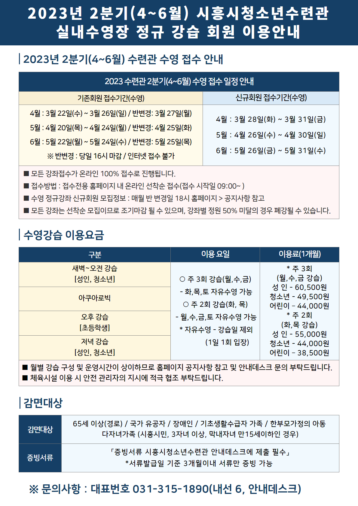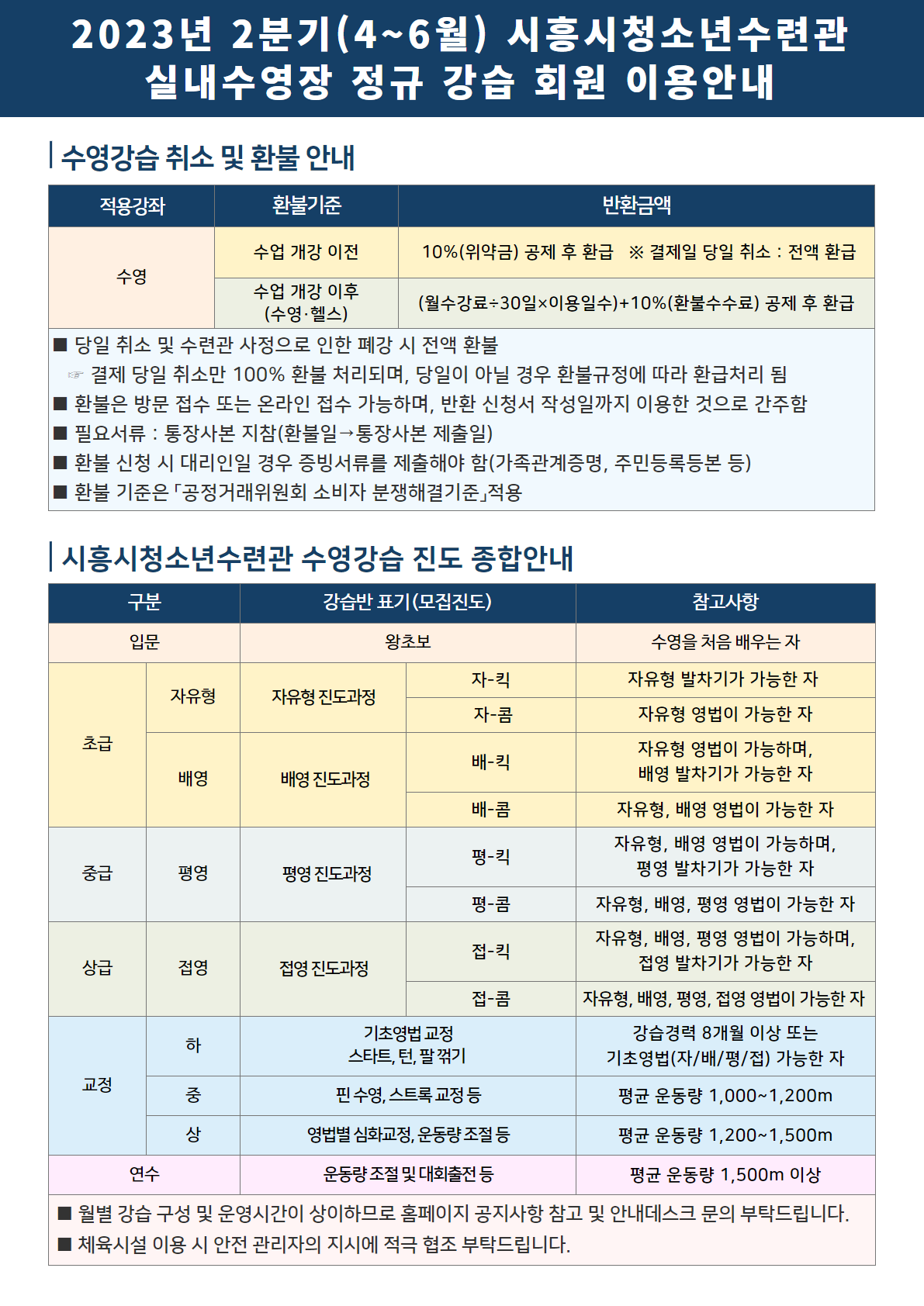 2023년 2분기(4~6월) 수련관 실내 수영장 정규 강습 회원 이용안내 작성자 관리자 등록일자 2023년 3월 16일 9시 29분 20초 조회 1,384 2023년 2분기(4~6월) 시흥시청소년수련관 실내수영장 정규 강습 회원 이용안내 1.png [ Size : 208.48KB , Down : 1,511 ] 미리보기 다운로드 2023년 2분기(4~6월) 시흥시청소년수련관 실내수영장 정규 강습 회원 이용안내 2.png [ Size : 202.99KB , Down : 1,018 ] 미리보기 다운로드 목록보기