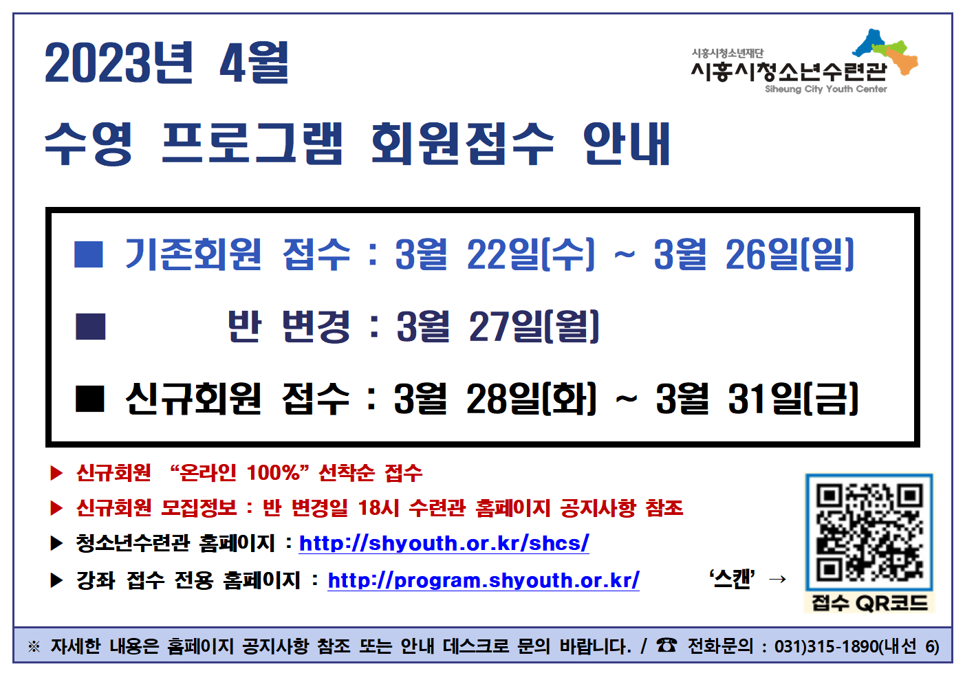 2023년 4월 수영 프로그램 회원(기존/신규) 접수 기간 안내 작성자 관리자 등록일자 2023년 3월 16일 9시 27분 57초 조회 565 접수 배너(23년 4월).png [ Size : 129.56KB , Down : 526 ] 미리보기 다운로드 목록보기