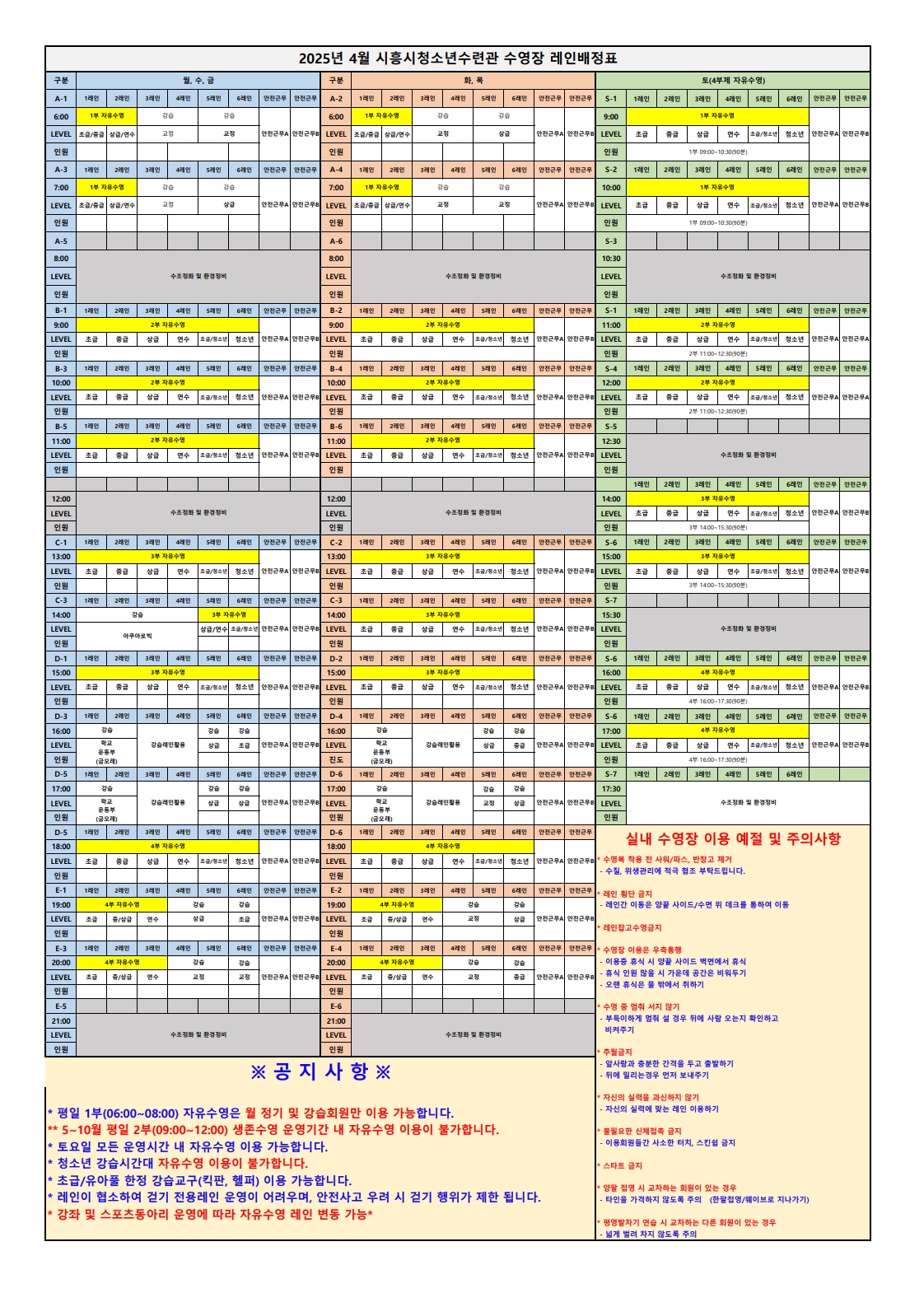 2025년 4월 시흥시청소년수련관 실내 수영장 레인 배정표 작성자 관리자 등록일자 2025년 4월 4일 17시 7분 52초 조회 451 2025년 4월 수영장 레인배정표(에티켓, 공지사항).jpg [ Size : 1.11MB , Down : 947 ] 미리보기 다운로드 목록보기