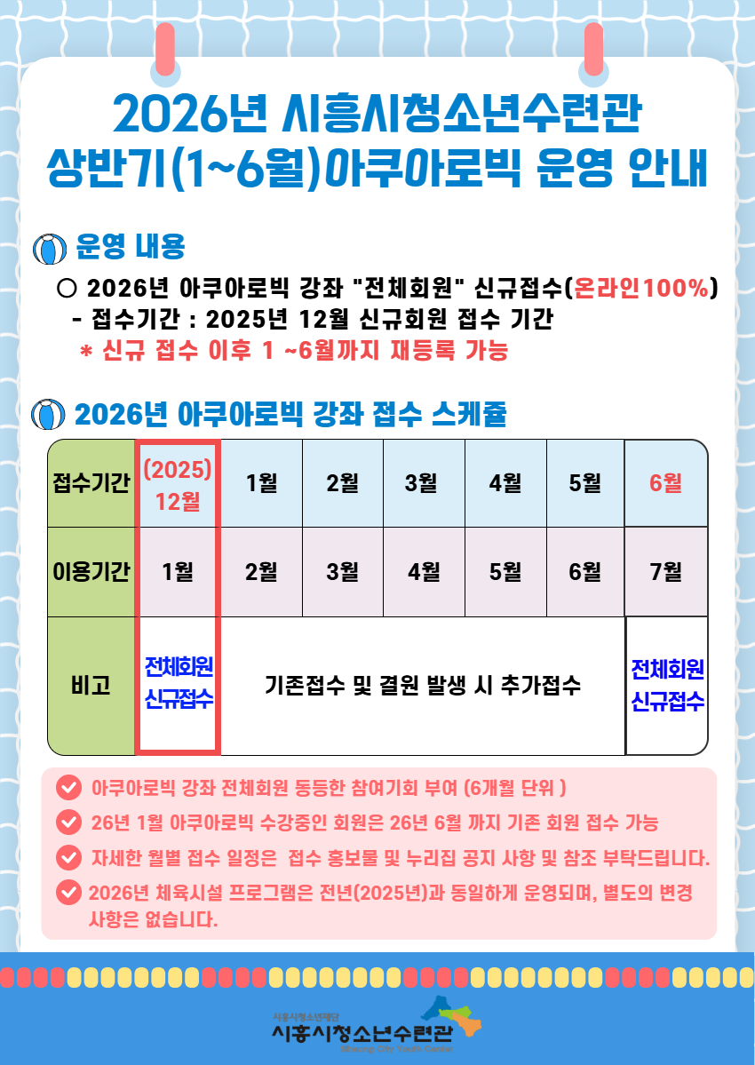 2026년 시흥시청소년수련관 상반기 (1~6월) 아쿠아로빅 운영 안내 작성자 관리자 등록일자 2025년 11월 28일 19시 22분 34초 조회 48 아쿠아로빅 운영 변경사항 안내.png [ Size : 165.22KB , Down : 54 ] 미리보기 다운로드 목록보기