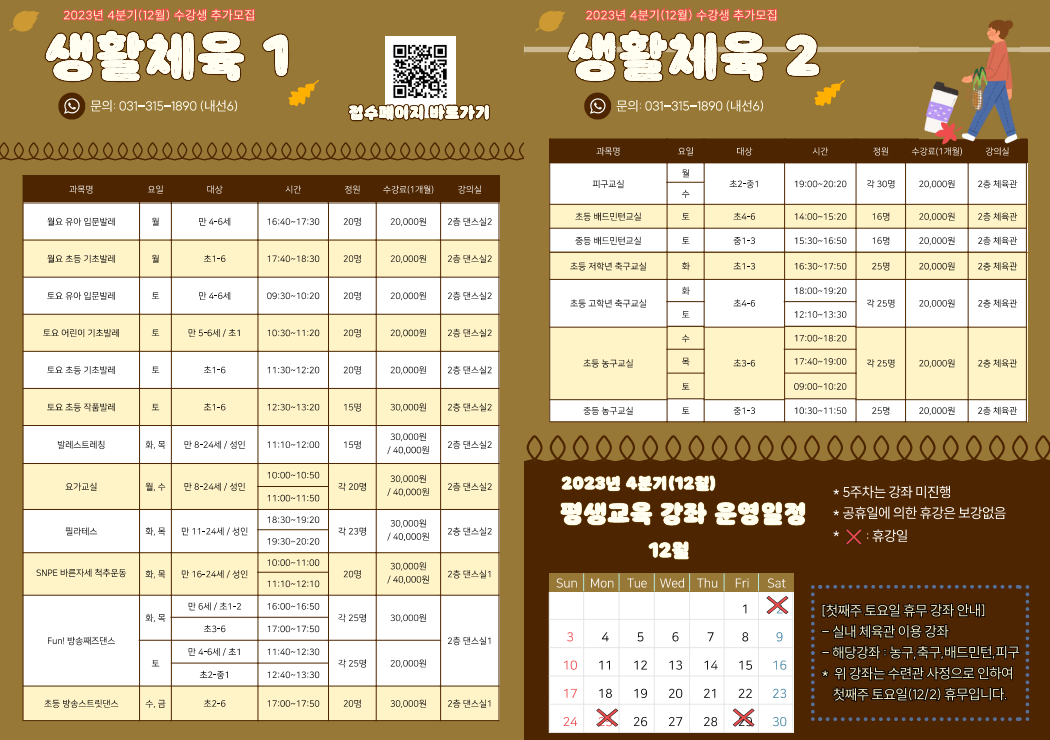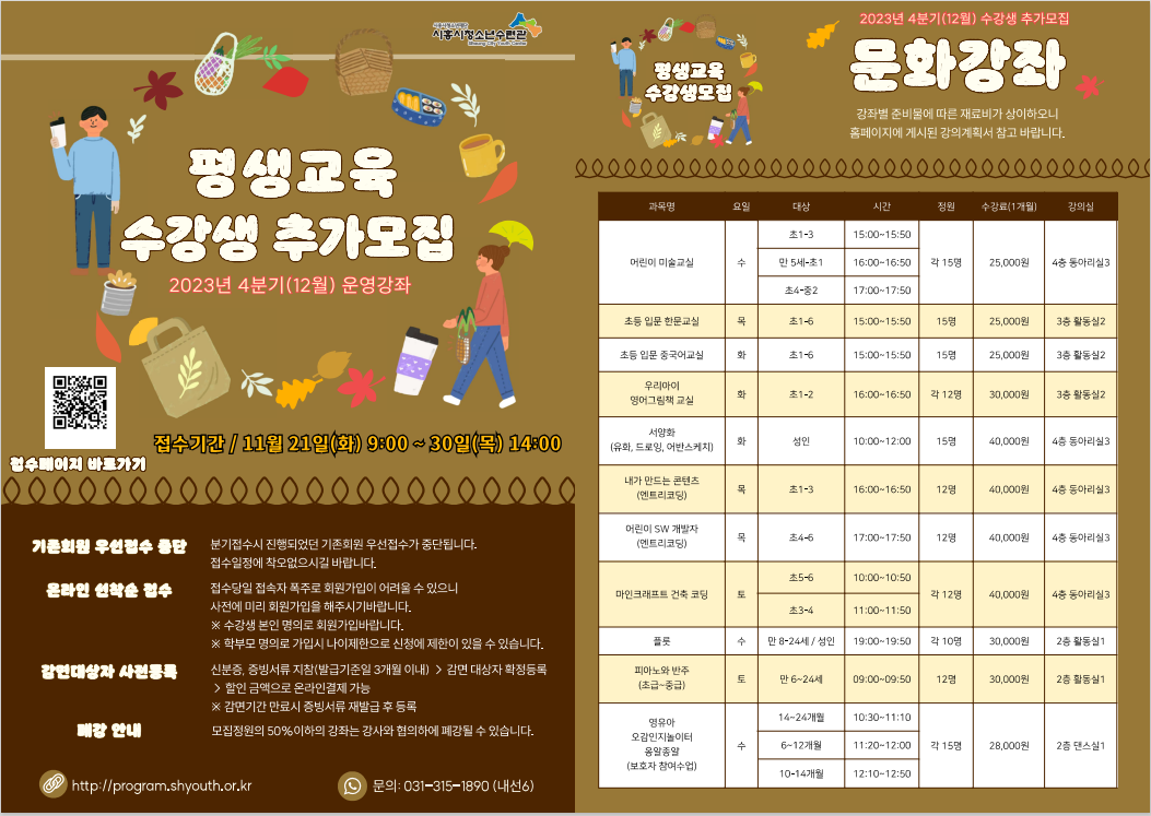 2023년 시흥시청소년수련관 12월 평생교육 추가모집 안내 작성자 관리자 등록일자 2023년 11월 13일 17시 44분 51초 조회 898 12월_1.PNG [ Size : 302.86KB , Down : 1,301 ] 미리보기 다운로드 12월_2.PNG [ Size : 253.27KB , Down : 1,235 ] 미리보기 다운로드 목록보기