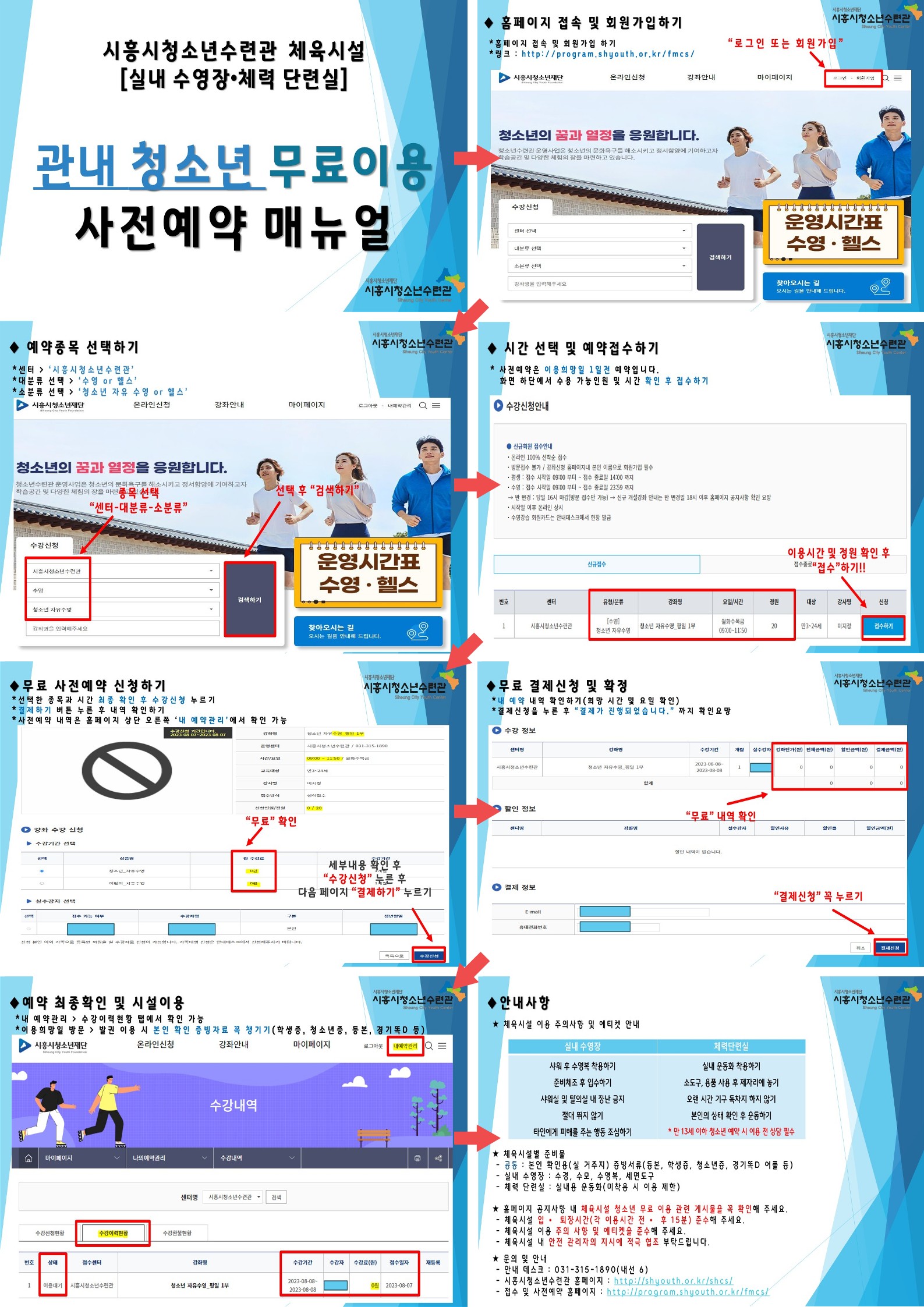 관내 청소년 체육시설 무료이용 사전예약 매뉴얼 안내 작성자 한아름 등록일자 2023년 8월 8일 14시 45분 49초 조회 579 관내 청소년 무료이용 사전예약 매뉴얼_1.jpg [ Size : 726.85KB , Down : 961 ] 미리보기 다운로드 목록보기
