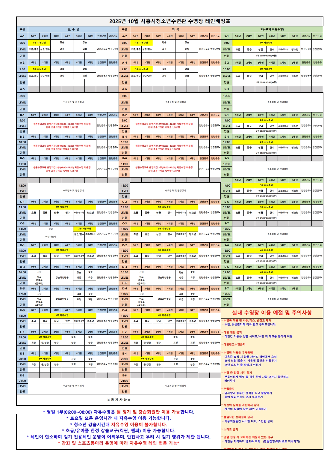 2025년 10월 시흥시청소년수련관 실내 수영장 레인 배정표 작성자 관리자 등록일자 2025년 10월 1일 13시 55분 52초 조회 213 2025년 10월 수영장 레인배정표_1.jpg [ Size : 1.11MB , Down : 313 ] 미리보기 다운로드 목록보기