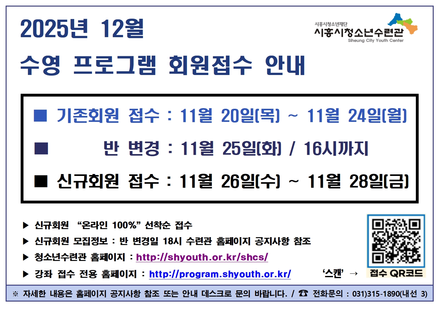 2025년 12월 수영 프로그램 회원(기존/신규) 접수 기간 안내 작성자 관리자 등록일자 2025년 11월 14일 21시 11분 49초 조회 3 기존접수 배너(25년 12월)001.jpg [ Size : 558.6KB , Down : 4 ] 미리보기 다운로드 목록보기