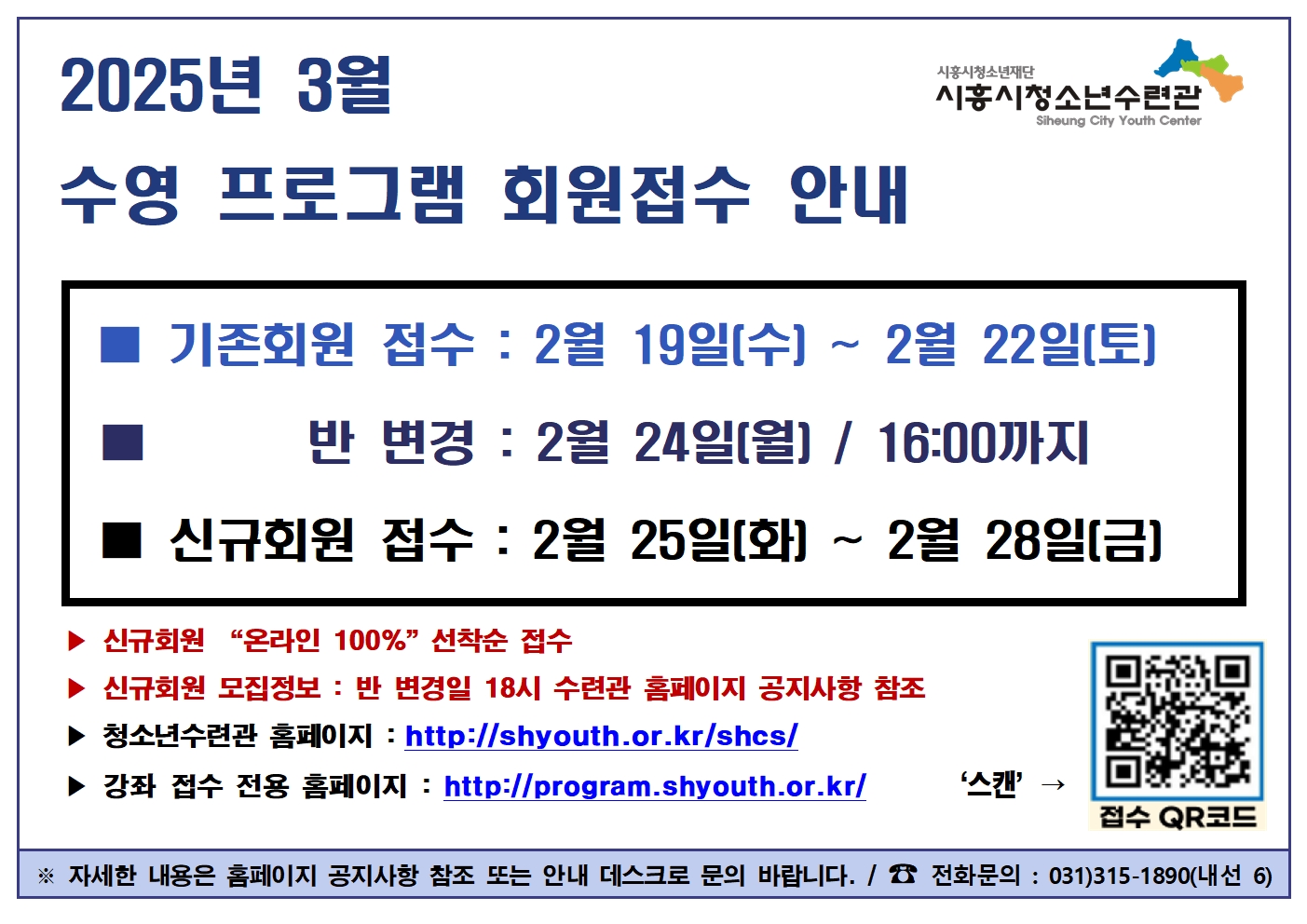 2025년 3월 수영 프로그램 회원(기존/신규) 접수 기간 안내 작성자 관리자 등록일자 2025년 2월 14일 14시 47분 17초 조회 570 기존접수 배너(25년 3월)001.jpg [ Size : 558.1KB , Down : 1,206 ] 미리보기 다운로드 목록보기