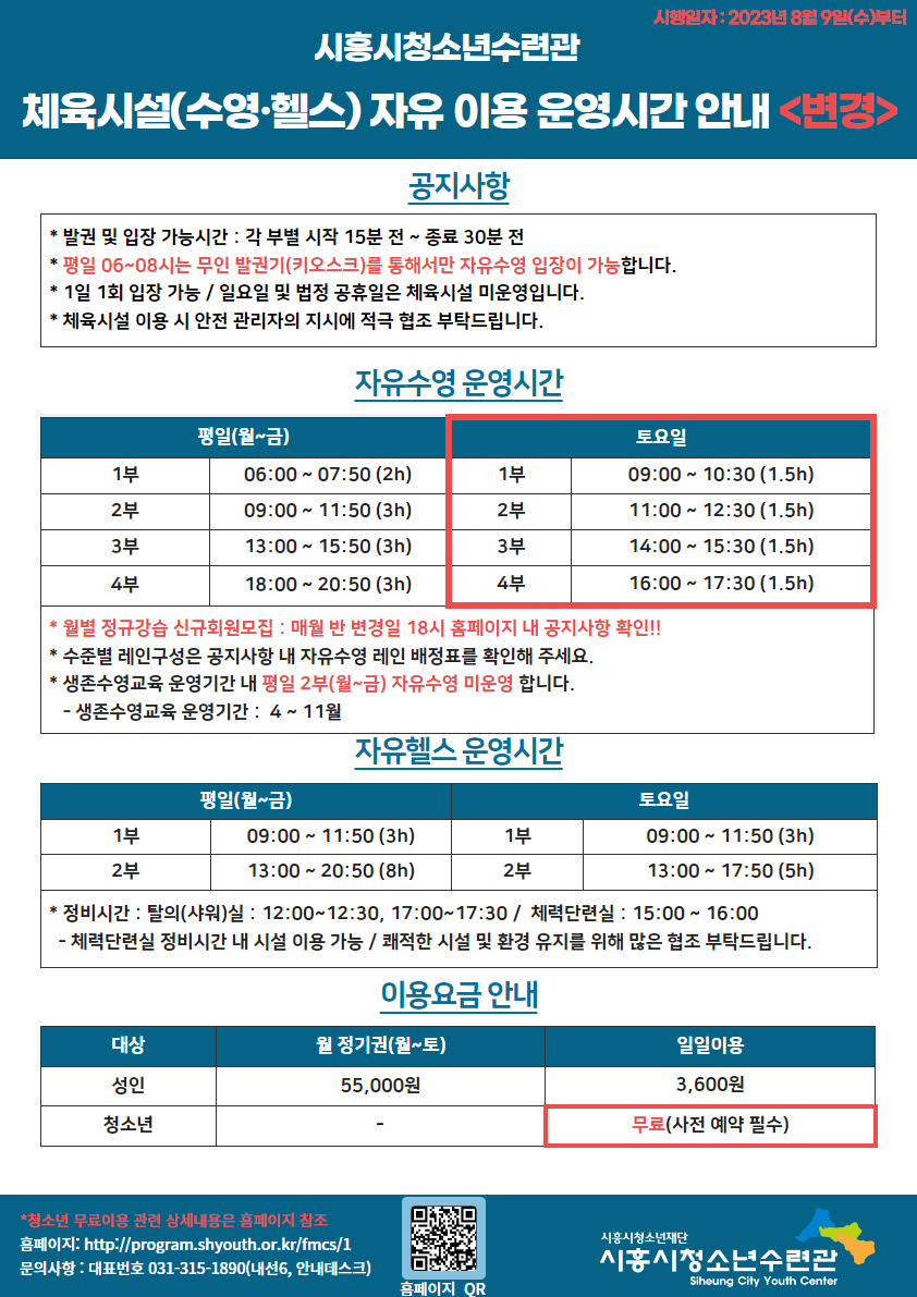 시흥시청소년수련관 체육시설(수영·헬스) 자유이용 운영 시간 안내 작성자 관리자 등록일자 2023년 8월 9일 7시 31분 8초 조회 694 배너제작용.png [ Size : 133.36KB , Down : 767 ] 미리보기 다운로드 목록보기