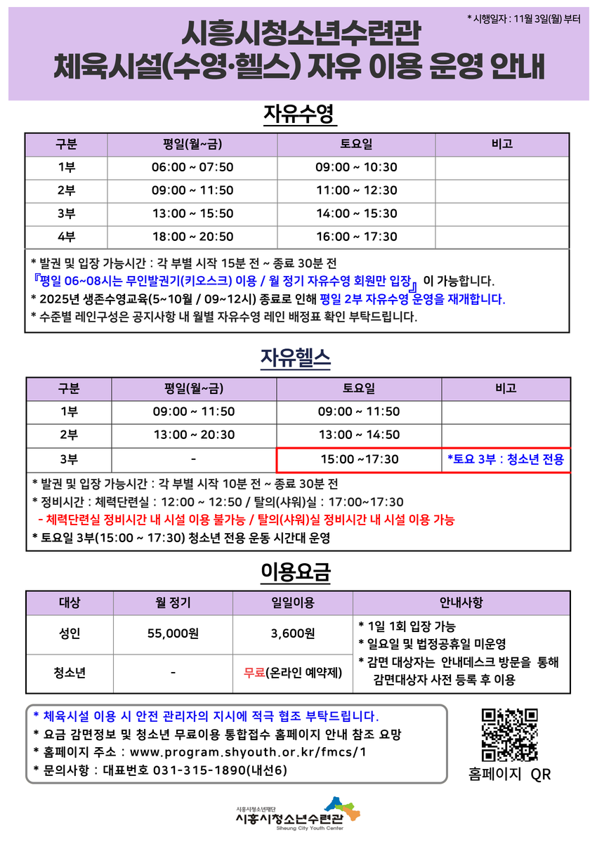 2025년 체육시설(수영·헬스) 운영 시간 안내(11월3일적용) 작성자 관리자 등록일자 2025년 10월 23일 16시 4분 11초 조회 127 체육시설 자유이용 안내(생존수정) 1.png [ Size : 306.5KB , Down : 174 ] 미리보기 다운로드 목록보기