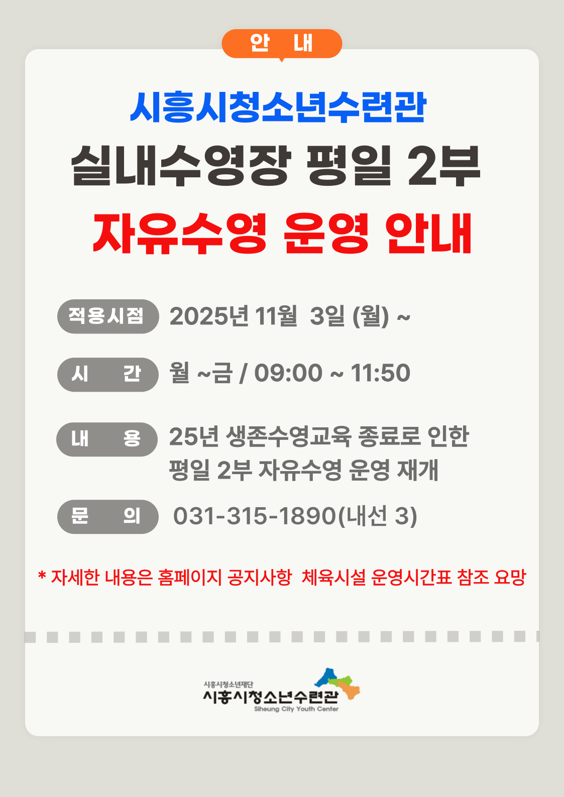 시흥시청소년수련관 실내수영장 평일2부 자유수영 운영 안내 작성자 관리자 등록일자 2025년 10월 23일 16시 6분 11초 조회 121 제목을-입력해주세요_-001 (4).png [ Size : 176.82KB , Down : 147 ] 미리보기 다운로드 목록보기