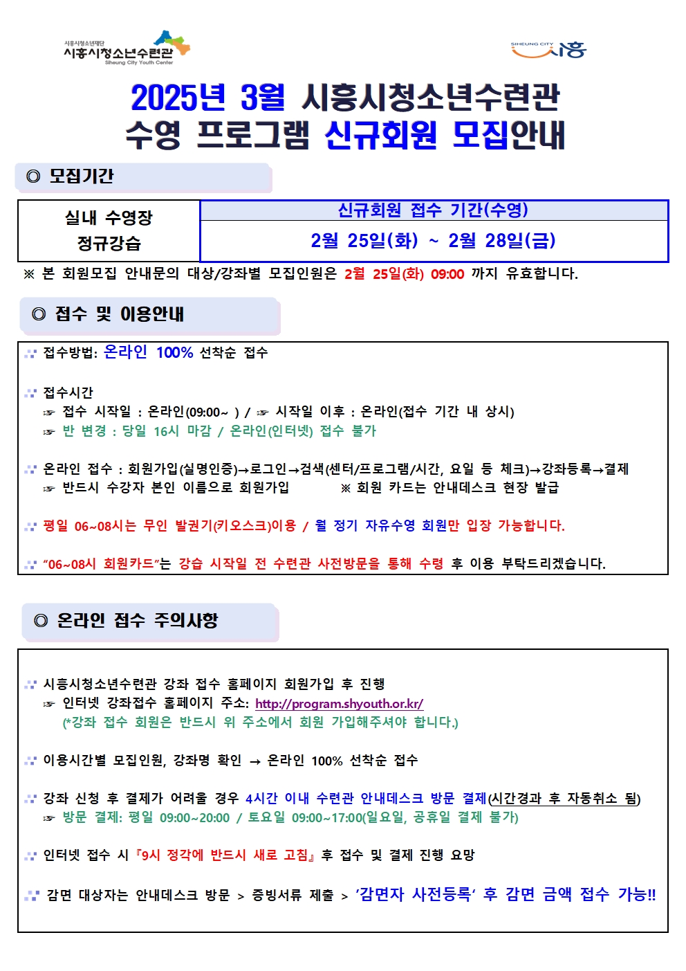 2025년 3월 시흥시청소년수련관 수영강좌 신규회원 모집안내001.jpg [ Size : 618.93KB , Down : 2,245 ] 미리보기 다운로드